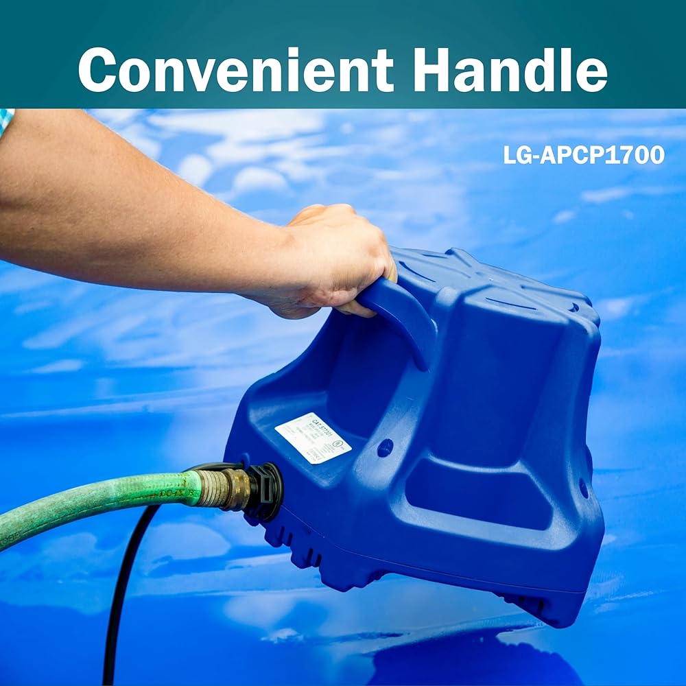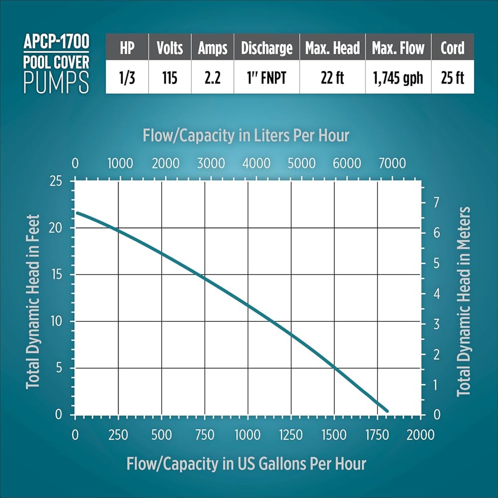 Water remaining on pool covers for an extended period adds extra weight and can cause ripping or tearing resulting in costly repairs or replacement. The Little Giant APCP-1700 115-Volt, 1/3 HP, 1745 GPH pump removes water from pool covers, boat covers or rooftops - providing added protection from prolonged accumulation of precipitation. The APCP-1700 easily attaches to a standard garden hose for effortless water removal. This pump is equipped with a 1/3 HP energy-efficient, permanent-split capacitor (PSC) motor and 25-foot cord. The -APCP-1700 activates in approximately 2 in. of water and deactivates in approximately 1. in. of water. The APCP-1700 has a wide, weighted base design for added stability. The APCP-1700 is equipped with a 1-inch FNPT discharge and can be connected to 1-inch tubing for areas that frequently get heavy rain falls (1-inch to 2-inches per hour) for increased performance. Dimensions are 12 inches x 12 inches x 8.25 inches; weight = 13.5 lbs.