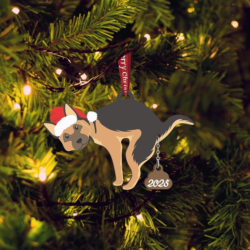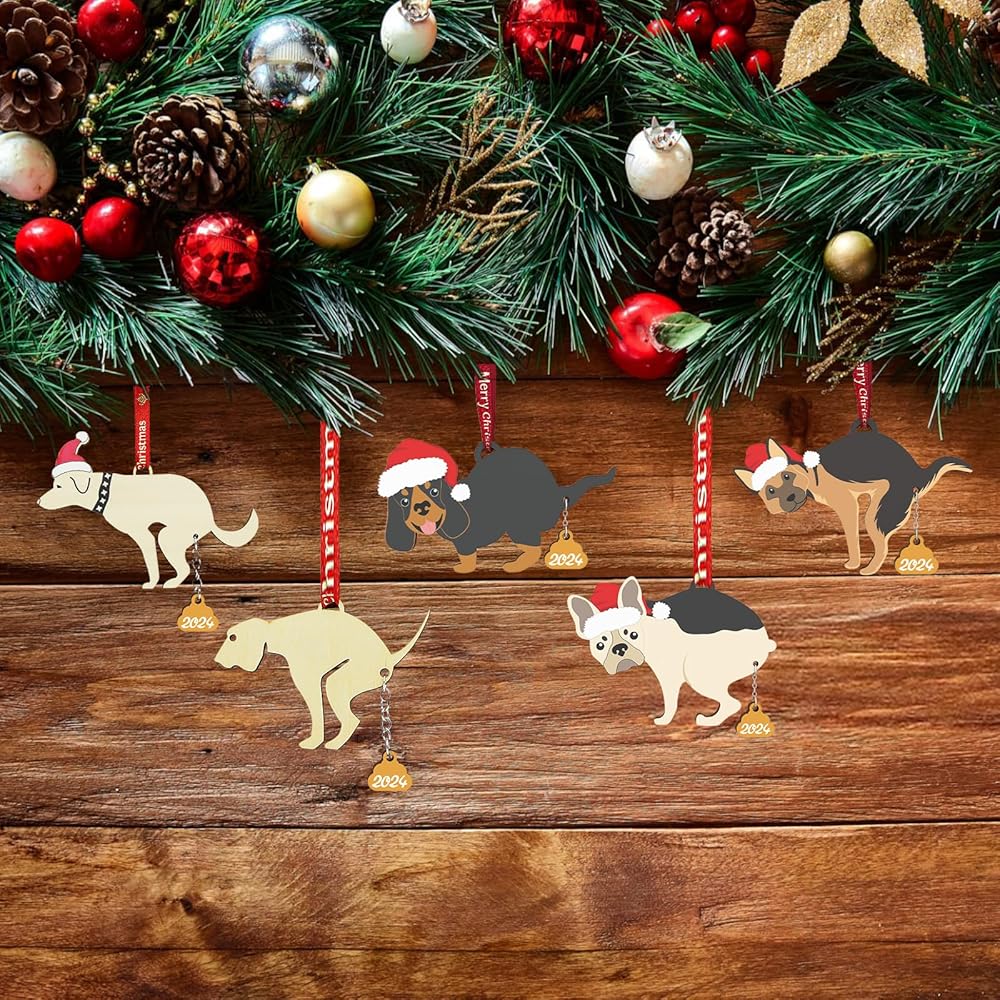 DOG ORNAMENTS MATERIALS: Natural blonde wood, 5MM thick and roughly 4 x 3.5 inches.Poop: Gold painted wood, 5MM thick and attached by a metal chain to the butt (hole) Ribbon: Classic Christmas Red, 2.5 inches long.