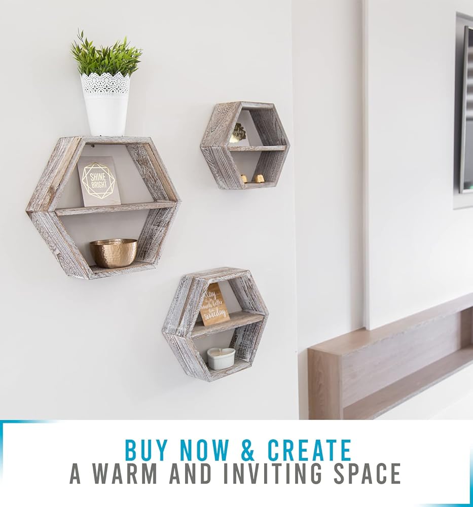 Floating geometric shelves: Display charming showpieces, decorative items, and other prized possessions while offering functional storage with wooden display shelves. Reduce clutter and highlight your rustic décor while keeping everything organized