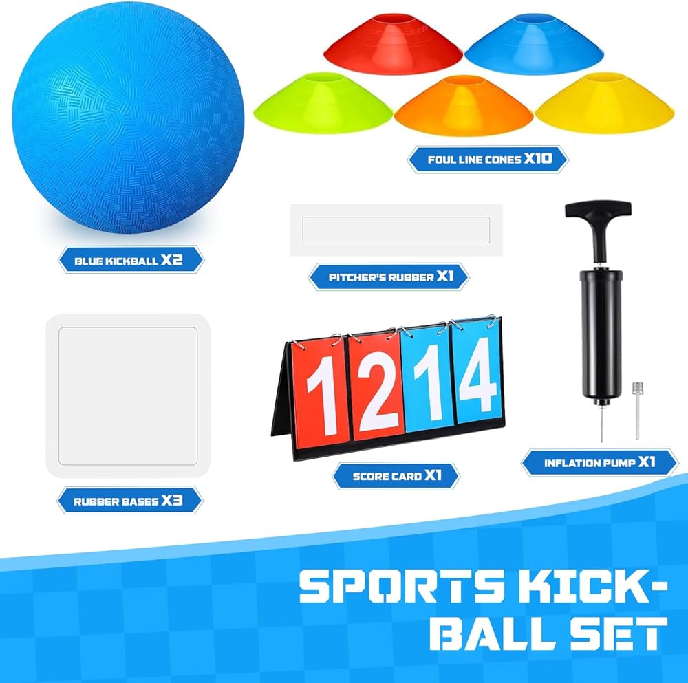 COMPLETE KICKBALL SET: The package come with 2 pieces of 9" balls, 10 pieces of foul marker discs, and 5 pieces of bases for kickball, an air pump and a scoreboard, our kickball set is the ideal combination to meet your needs, enough to make you and your friend have fun.