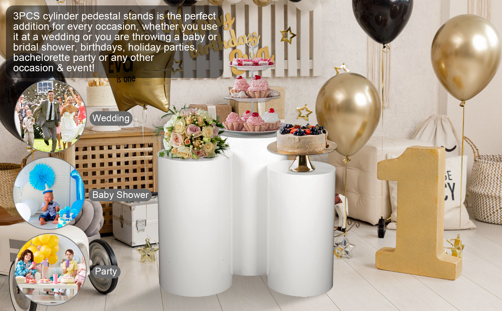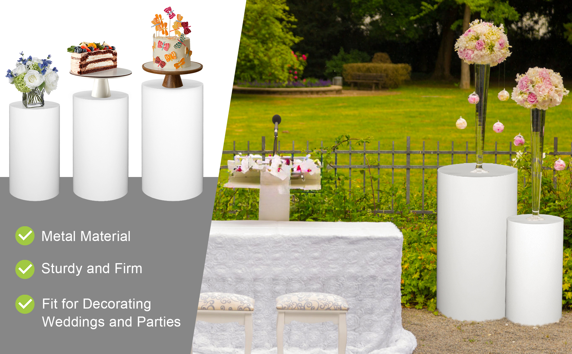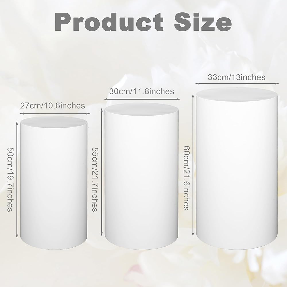 【Wide Application】The cylinder pedestal stand set is ideal for birthday parties, weddings, baby showers, bridal showers, anniversaries, and family gatherings, these pedestal stands covers serve as eye-catching backdrop decorations.