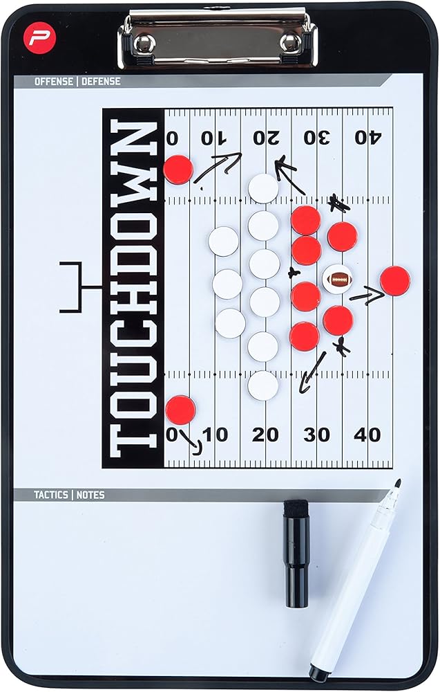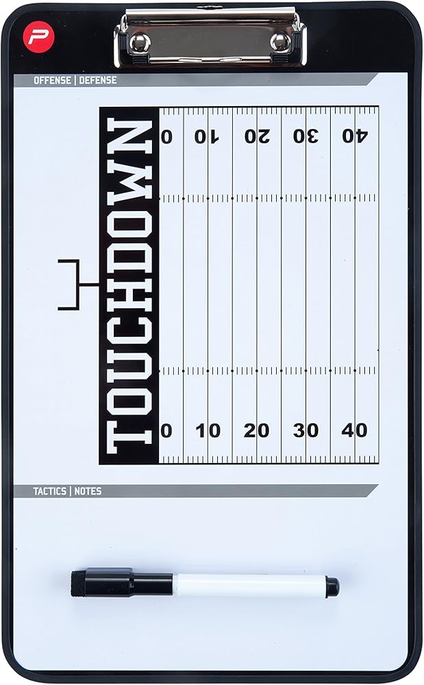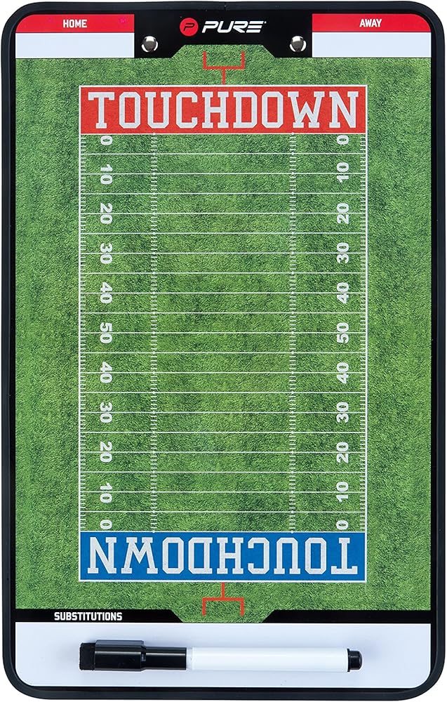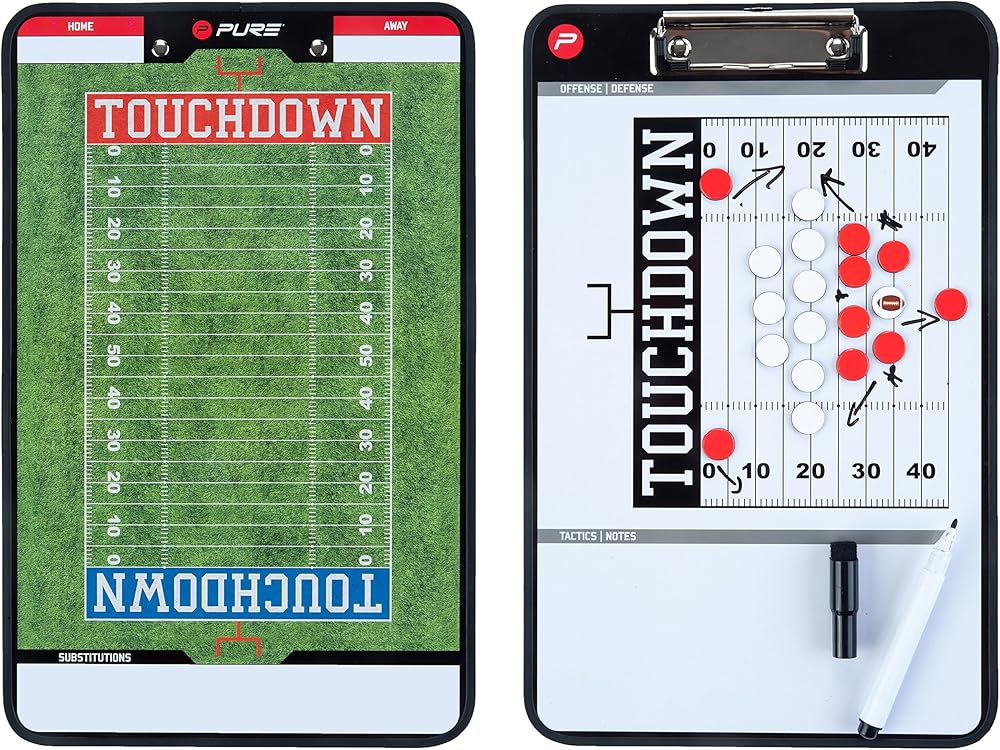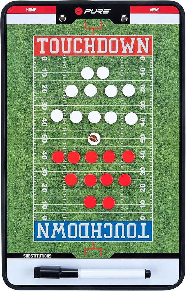 Pure2Improve coach board American football. Use this double-sided Pure2Improve magnetic, dry-erase, coach-board to align your team and track your stats. One side includes a full court/field for diagramming plays, while the other side allows you to set up plays using the white and red round magnets, and allows you to track fouls, timeout, and matchups. This helps you to communicate better and faster what you want to make clear to your team. You can also write down key-points for everybody to remember. The coach-boards are made of lightweight plastic and include a whiteboard-marker (easy to erase) and magnets.
