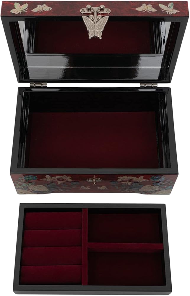 Mother of pearl inlaid in lacquer finish – Featuring breathtaking Seashell Mother of Pearl inlay, this magnificent Wooden Jewelry Box is certainly a treat for the eyes! Stunning and adorned with mother of pearl flowers and butterflies this jewelry box is a must if you love gorgeous historic designs and bringing an authentic feeling into your home.