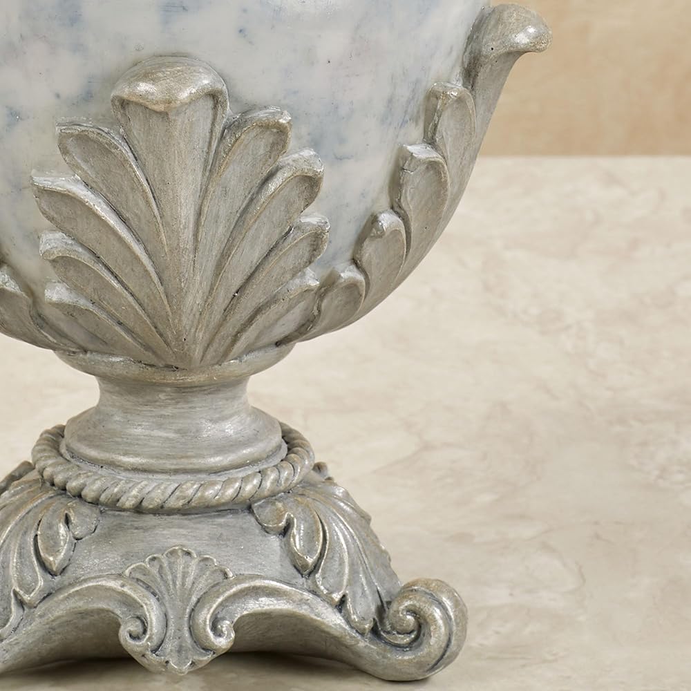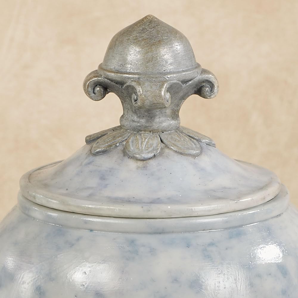 Handpainted marbled blue, brushed gray, and golden touches create a stately appeal upon the Lionna Decorative Covered Jar. Crafted from resin, the accent features a footed base, orb design, acanthus leaves, twisting designs, and a removable lid with scroll accents. Decorative use only. Perfect for storing your treasures, the covered jar measures 6 dia.x10.5 H. Designed by Touch of Class(R)! Handpainted in soothing shades Marbled blue and brushed gray design Accented with golden touches Traditional-style resin covered jar Lovely acanthus leaf motifs Holds your treasures.
