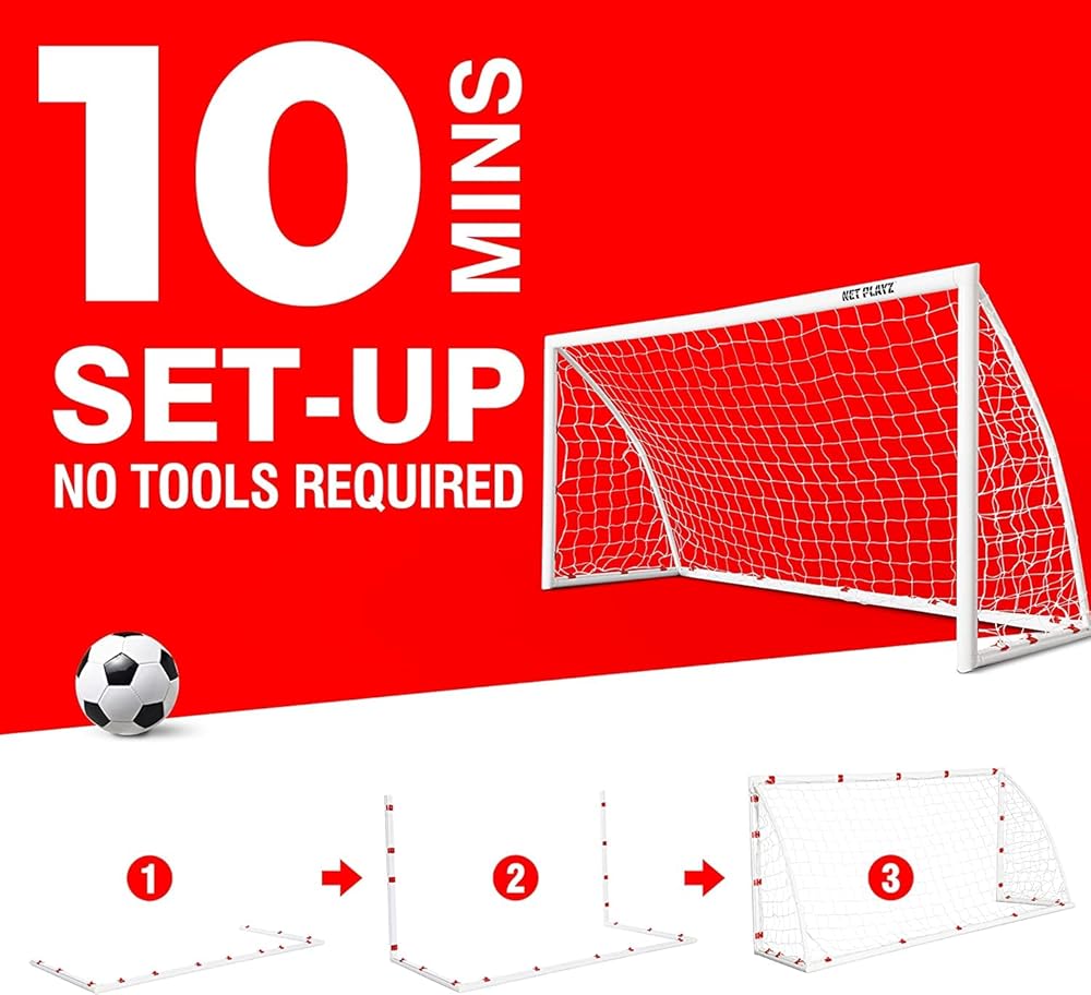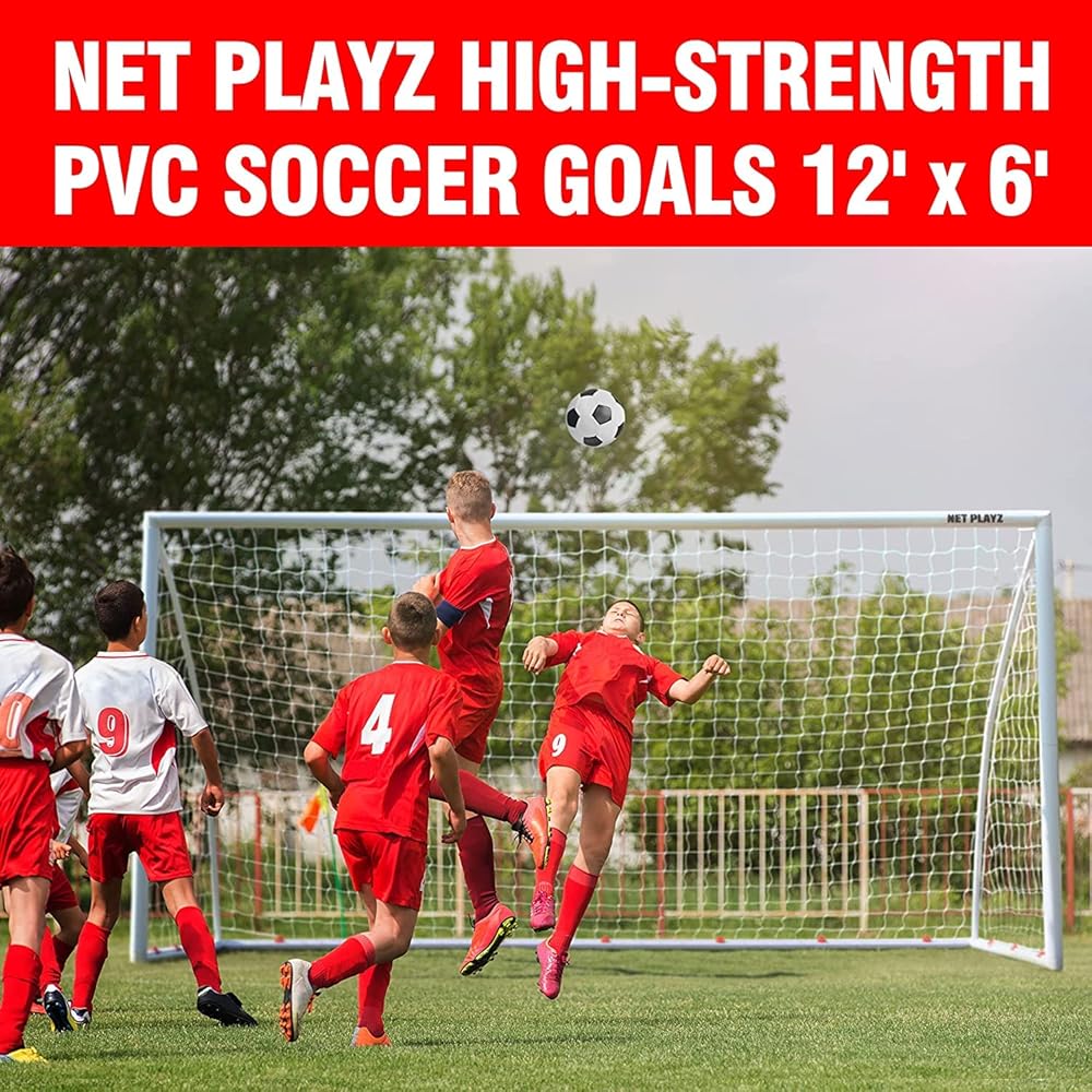 Net Playz PVC Soccer Goal 12 x 6 x 4Ft, featuring extra-strong PVC frame structure and 3D structural pole, easily attach net hook system, secure locking pins for fast assembly, and premium all-weather net. Sturdy enough for practice, a wonderful addition to your backyard.