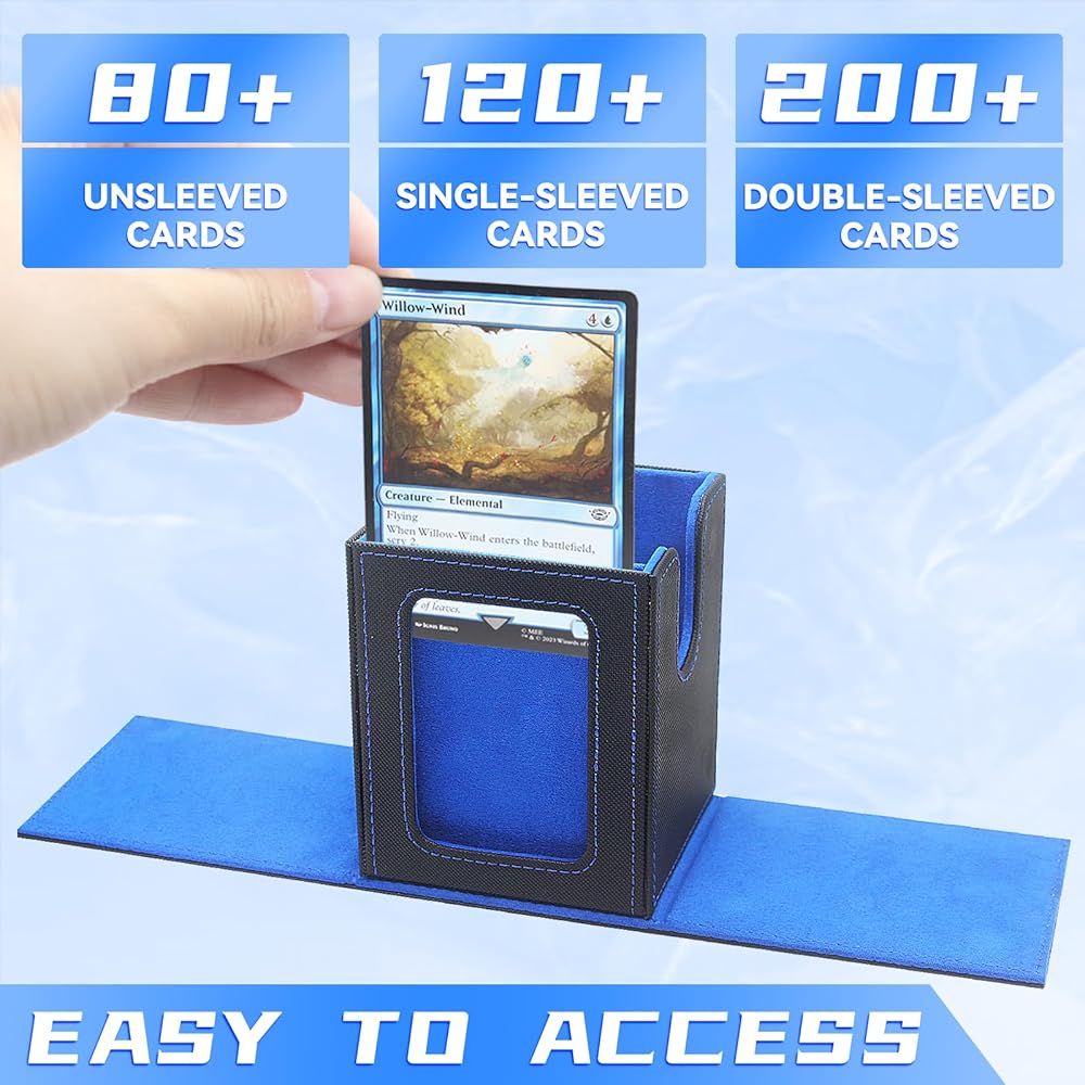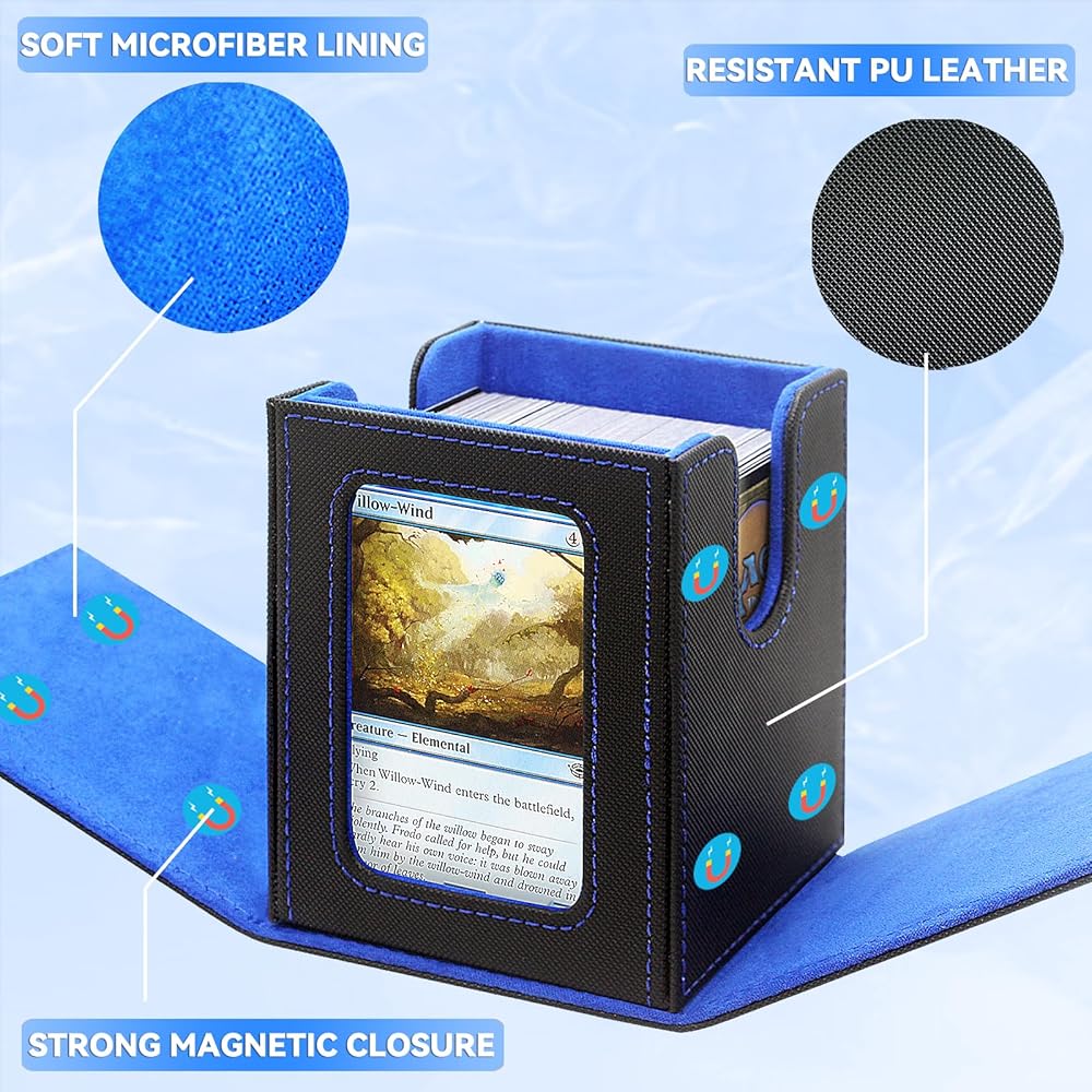 【SECURE DESIGN】Tight fitting, designed to prevent the collapse of valuable cards, powerful 4 magnets keep the card safe during transportation. The trading card storage can be tightly closed even when fully loaded and turned over. There is a window on the side of the card box to place your commander or avatar, ensuring that you quickly identify the groups of cards in each deck box.