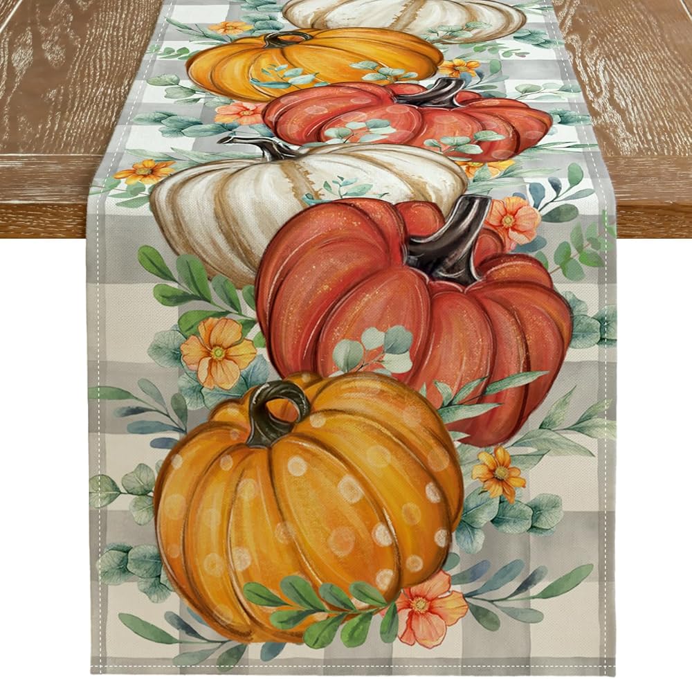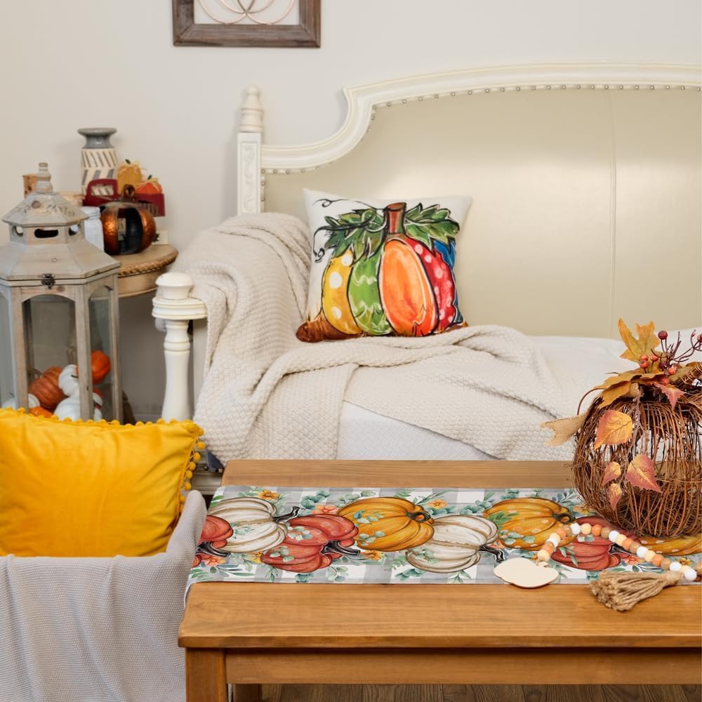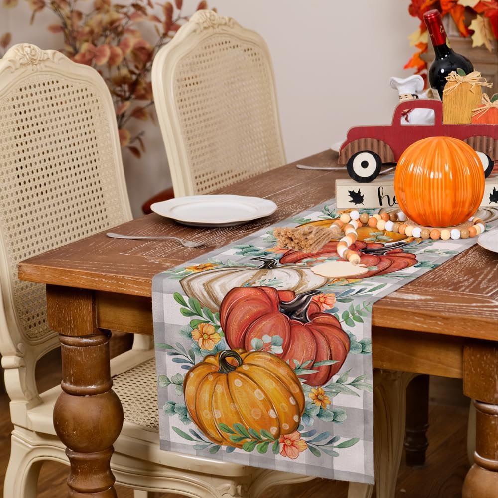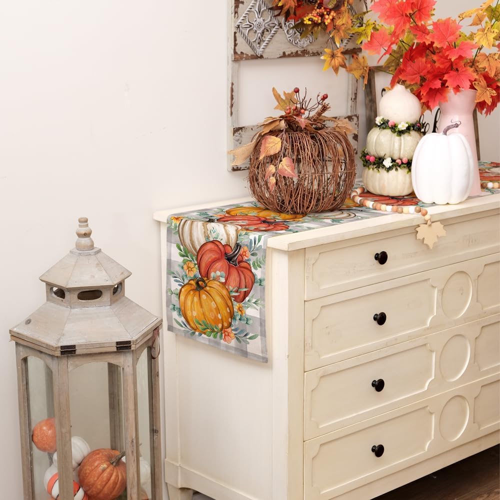 ARKENY Fall Grey Buffalo Plaid Pumpkin Table Runner 13x72 Inches, Thanksgiving Holiday Indoor Outdoor Table Decoration for Home