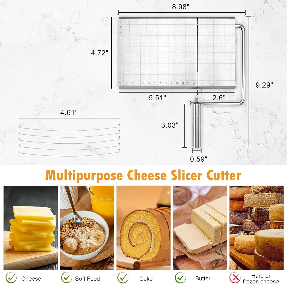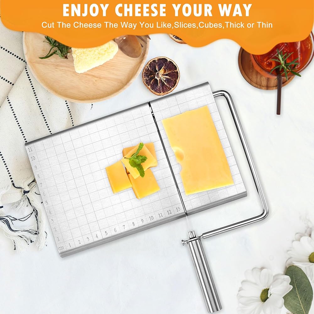 PRECISE & CLEAN CUT CHEESE SLICER: By lasering clear and precise grid scale lines on the board surface, which helps you to cut exactly according to the size you want from 1mm to cm, get rid of the guesswork about that the slice is too large or too small. (Board size: 4.92inch * 8.27inch).