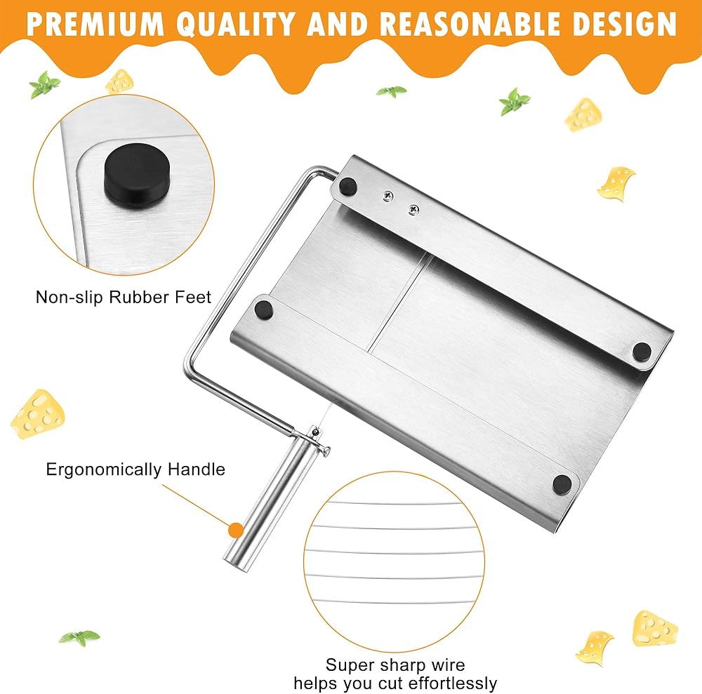 STAINLESS STEEL CHEESE SLICER CUTTER: Made of heavy-duty stainless steel for the whole cheese slicer including the blade, the right-sized tube handle is comfortable for hand gripping and also ensures easy control on cutting; 4 silicone rubber feet on the bottom not only prevents slippage, but also can protect your countertop from potential scratching damage.