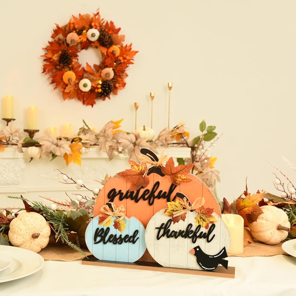 Cute Festive Fall Decoration: The fall pumpkin sign decorations with the words "Grateful, Thankful, Blessed"; eye-catching fall wooden signs will elicit compliments from your guests, adding excitement to your fall and Thanksgiving