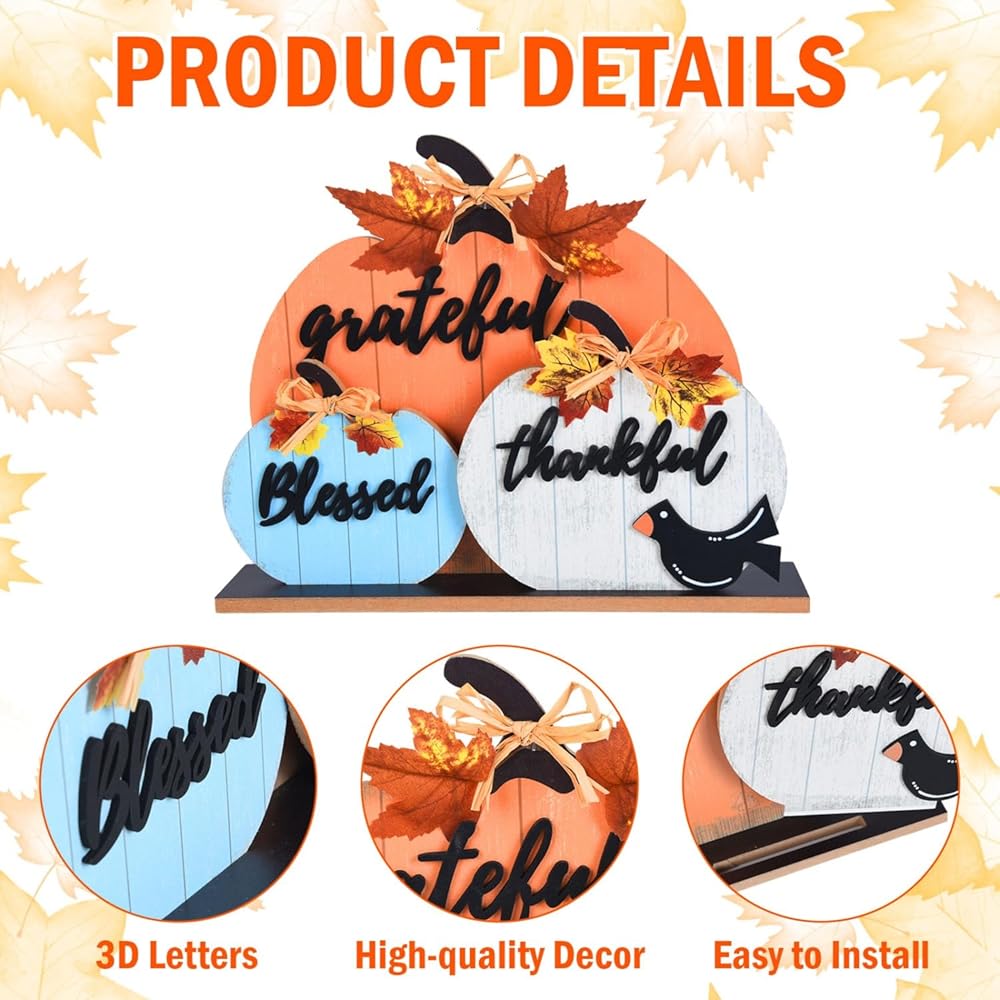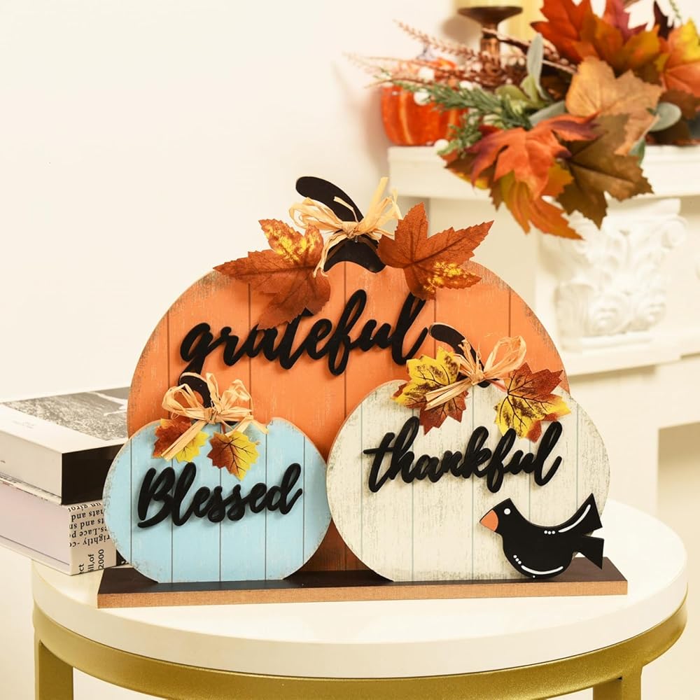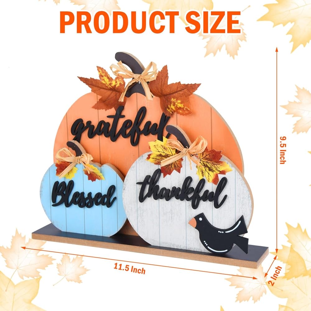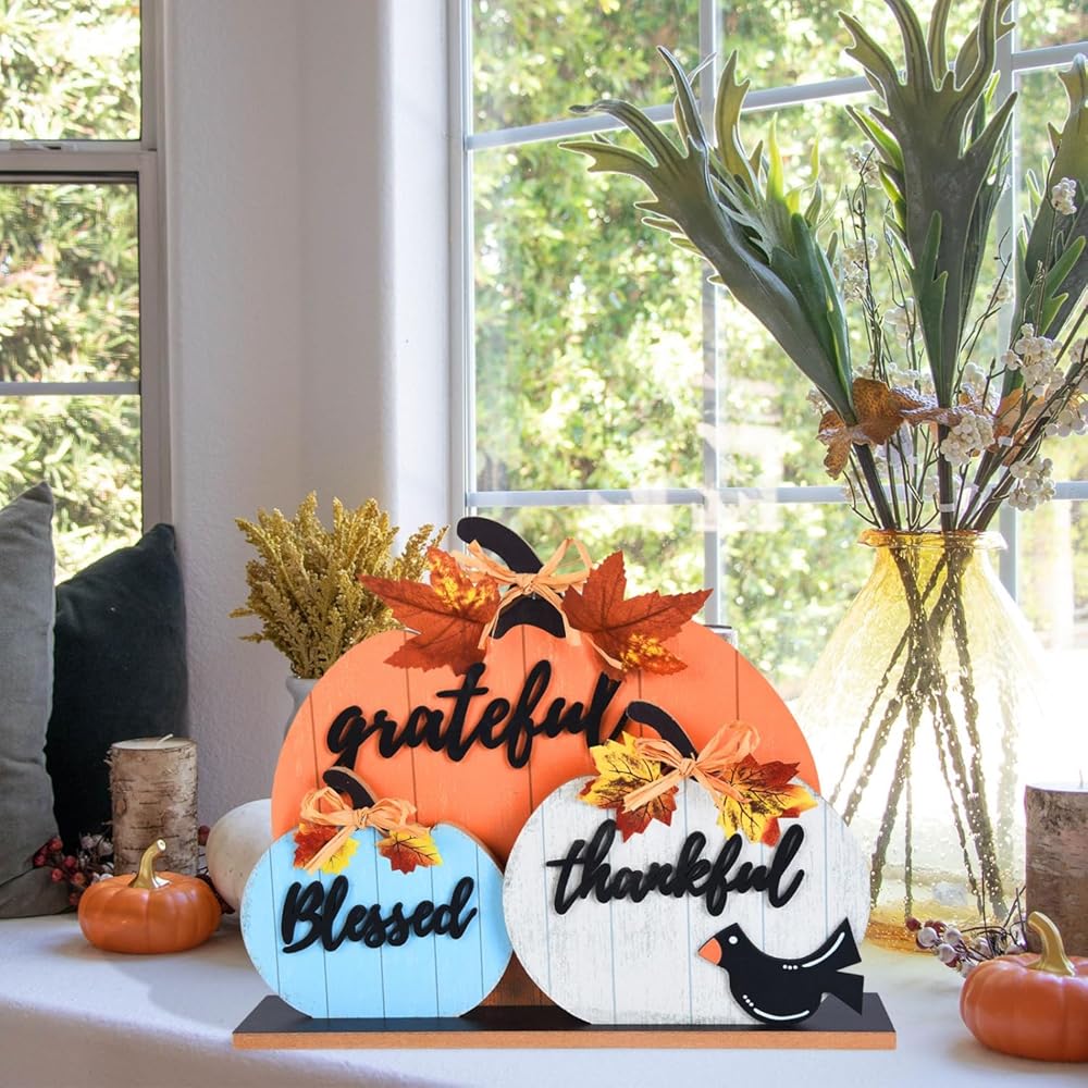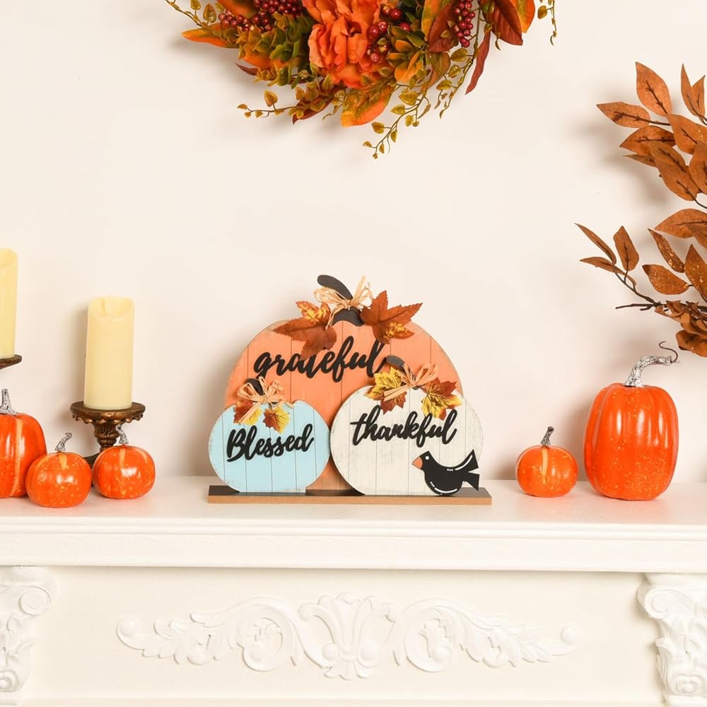 Fall Decorations for Home Farmhouse Wooden Pumpkin Decor Indoor Grateful Thankful Blessed Tabletop Sign Thanksgiving Decorations for Table Fireplace Mantle