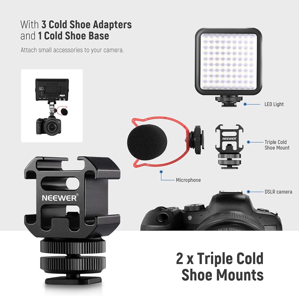 【Triple Cold Shoe Mounts】 Featuring 3 cold shoe adapters and a cold shoe base, the triple cold shoe mounts attach several small LED lights and microphones to a DSLR & mirrorless camera
