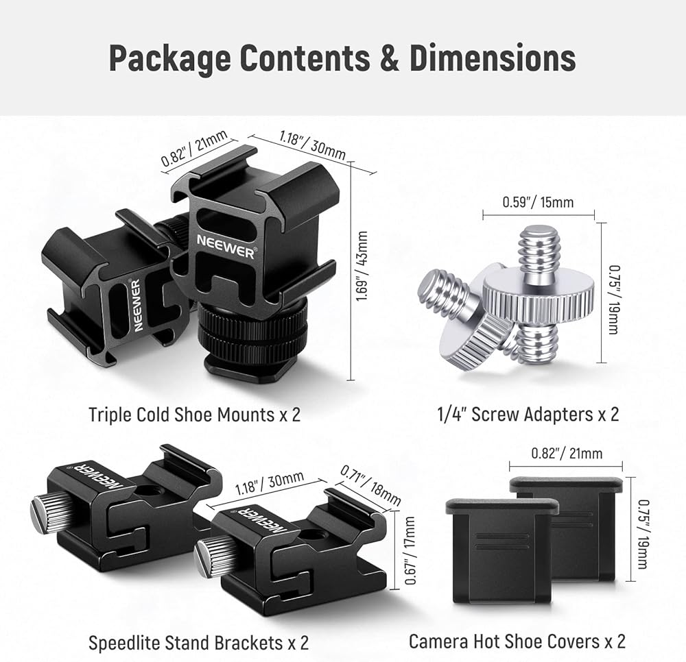 【8PCS Shoe Mount Adapter Set】 This 8 in 1 set includes two triple cold shoe mounts, two speedlite stand brackets, two camera hot shoe covers, and two 1/4" to 1/4" male screw adapters. Made with premium materials, consisting mainly of aluminum alloy with the exception of the plastic hot shoe cover), the adapter kit provides a complete solution for mounting camera accessories.