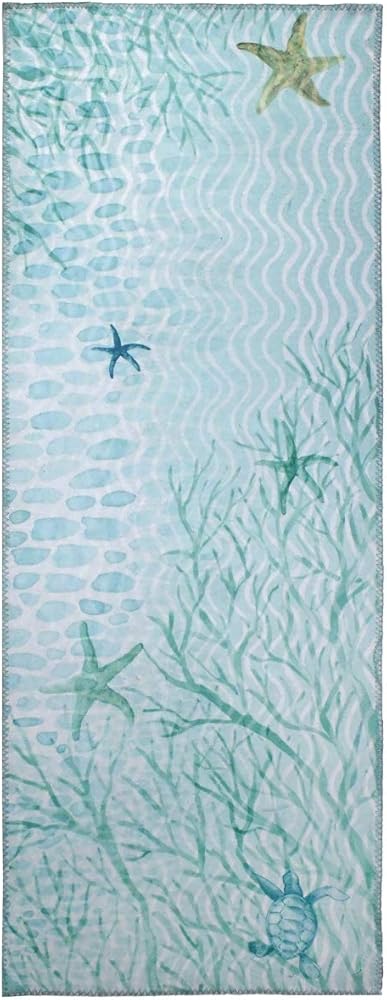 Printed polyester on this Homefires by Jellybean polysued floor cloth offers a clear aquamarine view of the sea coral. Designed by Sherri Buck Baldwin, this floor cloth is machine washable. Ultra thin construction allows chair to slide easily across the surface of this heat set printed floor cloth. Care Instructions. Vacuum regularly with floor only setting Do not use a beater bar or you may sweep the rug. Machine wash in cold water on the gentle cycle. Line dry or dry flat. A liner is recommended to provide slip resistance and possible color transfer or chemical reaction to manufactured flooringSpecifications. Rug Size 21 x 54. Rug Content 100% Super Soft Velvety Feeling Polyester. Backing Content 100% Polyester. Construction Sherri Buck Baldwin. Weight 3 lbs