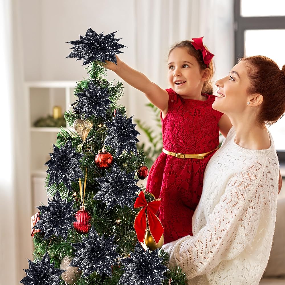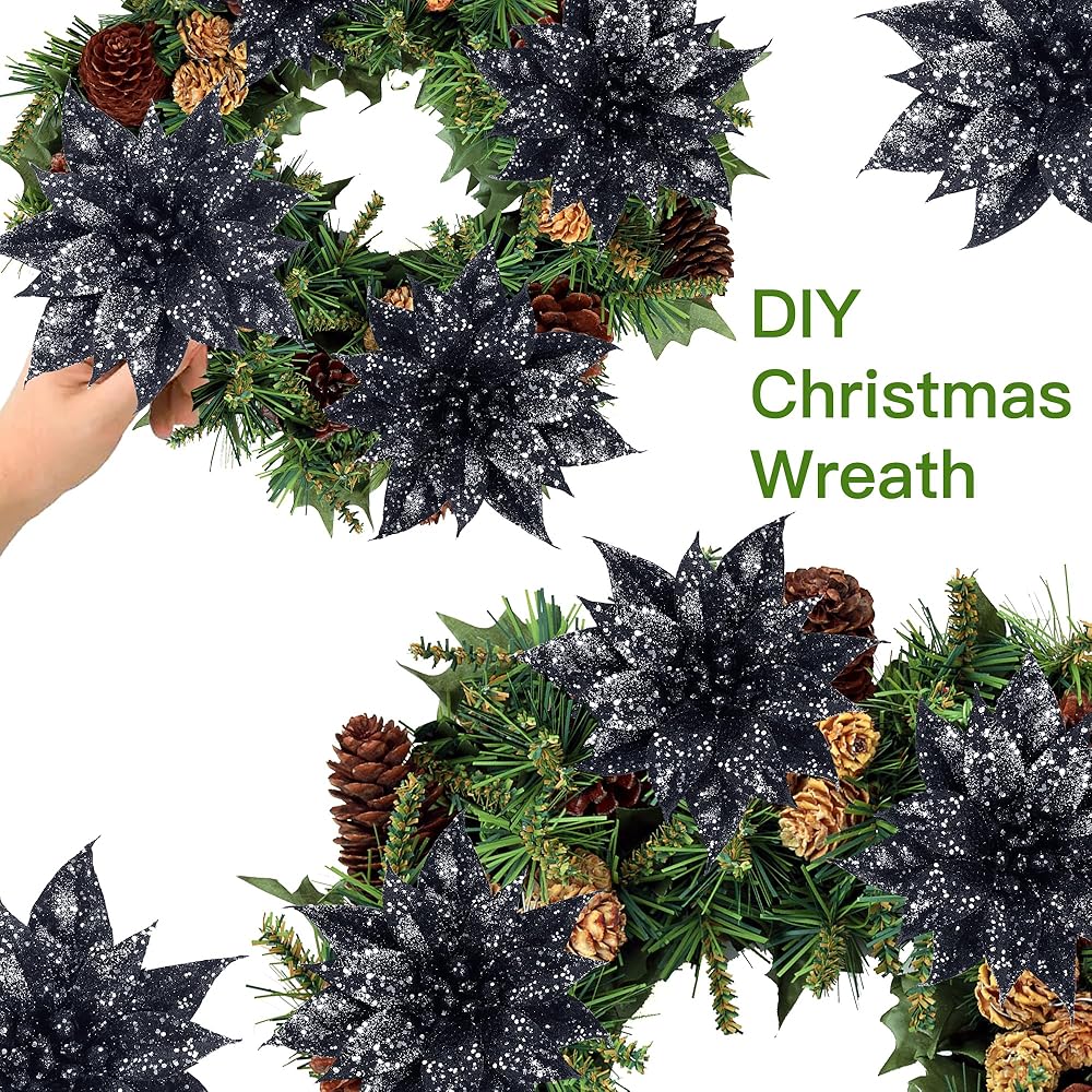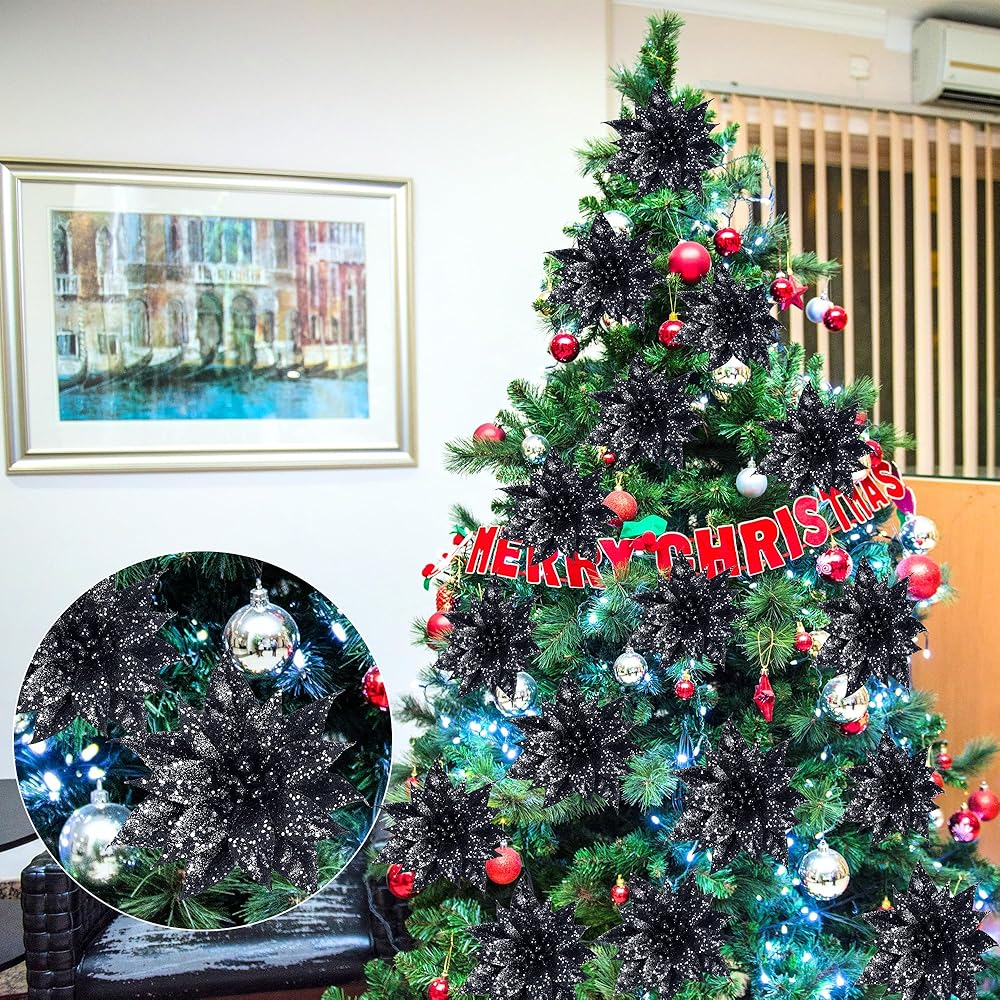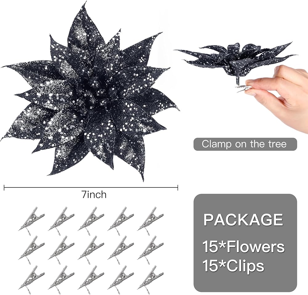 Sggvecsy 15 Pcs Halloween Christmas Glitter Flowers Christmas Tree Ornaments Shining Artificial Poinsettia Christmas Flowers Decoration with Clips for Xmas Holiday Wedding Wreath Decorations(Black)