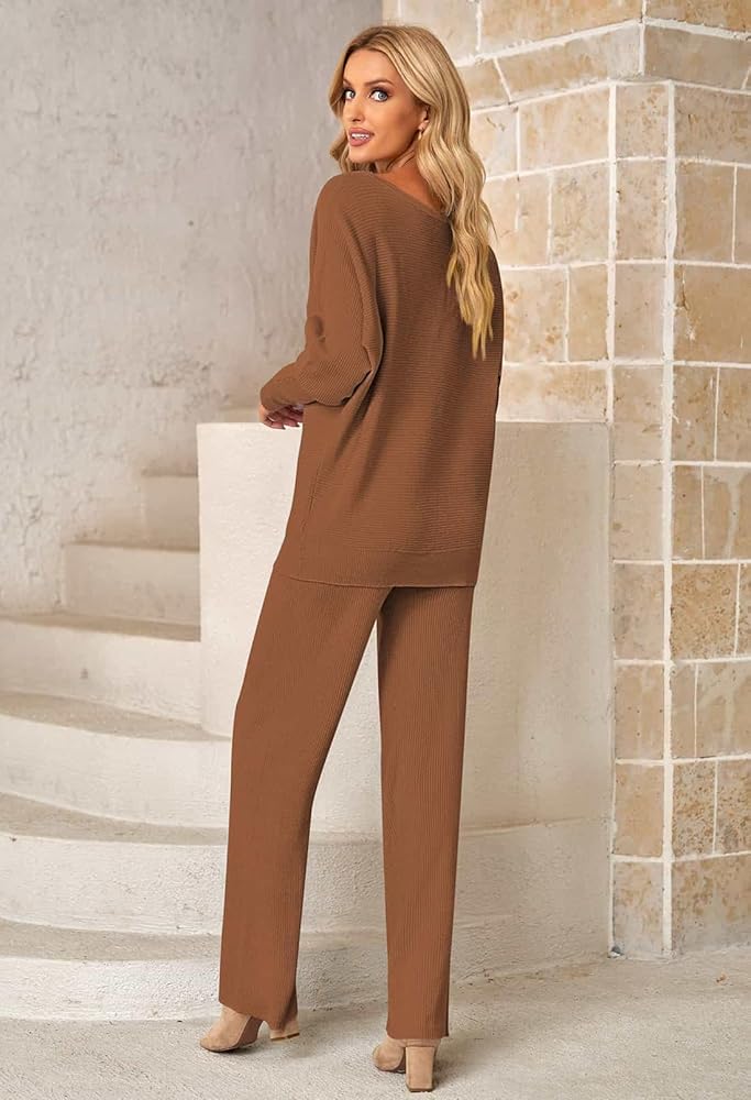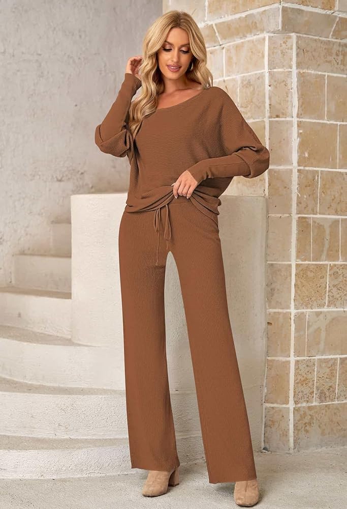 AOHITE Womens 2 Piece Outfits One-Shoulder Knit Pullover Sweaters Top Wide Leg Pants Sets Sweatsuit Tracksuit