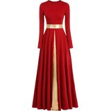 Unique Design: Classic modern liturgical dance dress. A metallic block stitched cross accents the front. Metallic gold stitching at the waist accentuates your waistline. long sleeves, pull-to-fit, loose fit, ruffled swinging maxi dress is an Easter church