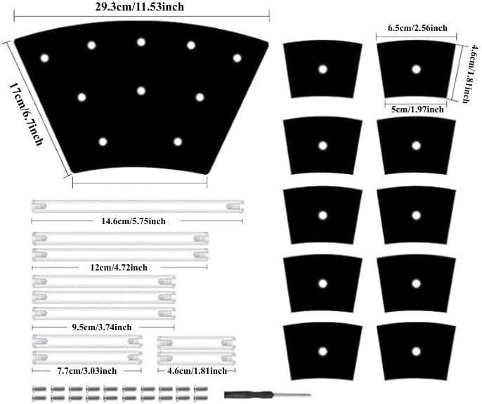 Package Contents: 1x big display base. 9 X transparent support rods, 9 X small black display base,18 X flat screws, 1 X screwdriver.