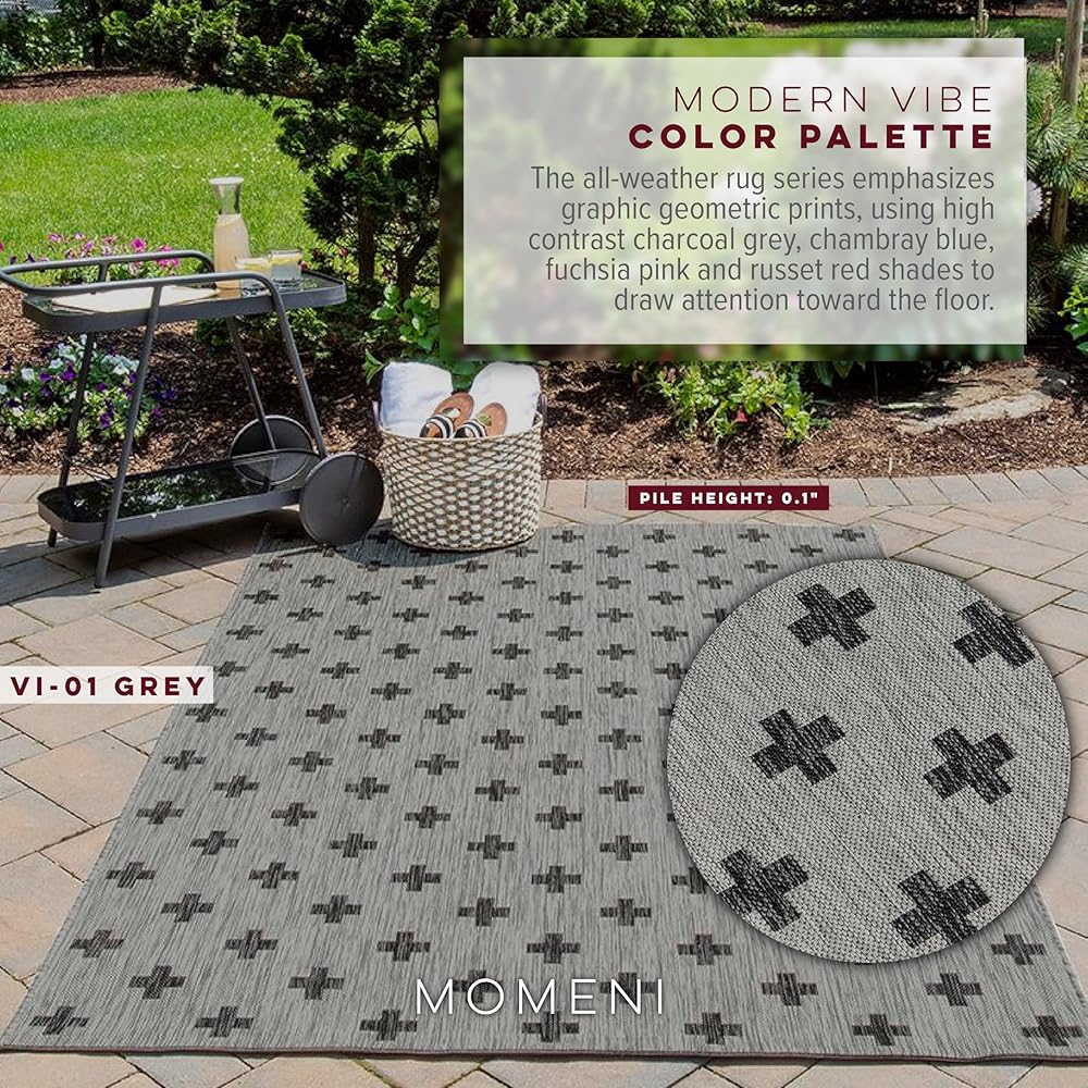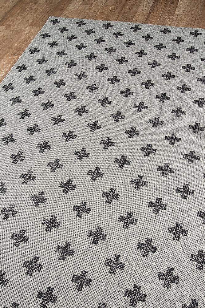 All-weather textiles get the graphic treatment in the all-over pattern of this indoor/outdoor area rug. The geometric print is a striking repeat of black crosses that cover the grey background in shapes that recall the Romanesque cutouts of classical Italian architecture. Resilient polypropylene fibers are stain, heat and UV-resistant, retaining their color and texture throughout consistent exposure to the elements.