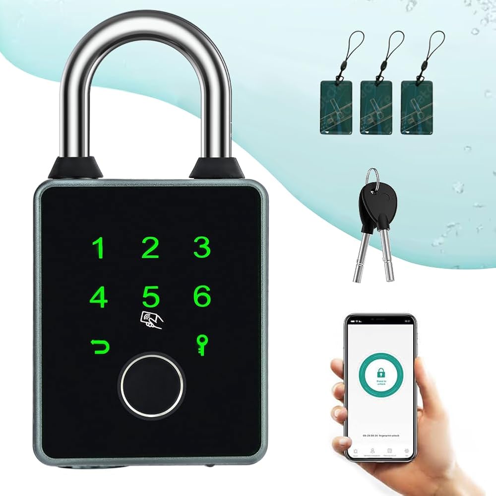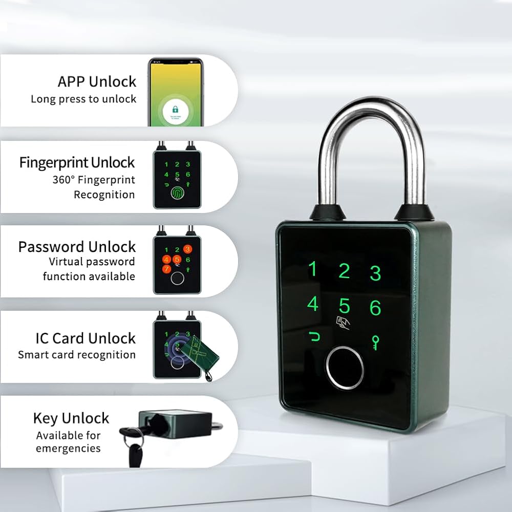 【Bluetooth padlock with key 】- The smart padlock have 5 ways to unlock . 1.fingerprint 2.password 3. Application 4.Mechanical key 5. IC card .And connect the smart padlock to the free mobile app (TT LOCK, It also works with other smart platforms such as Alexa and Google Home)via Bluetooth. You can use this application to register IC card,set the password, authorize users, view the record of the last 1000 unlocks, etc.