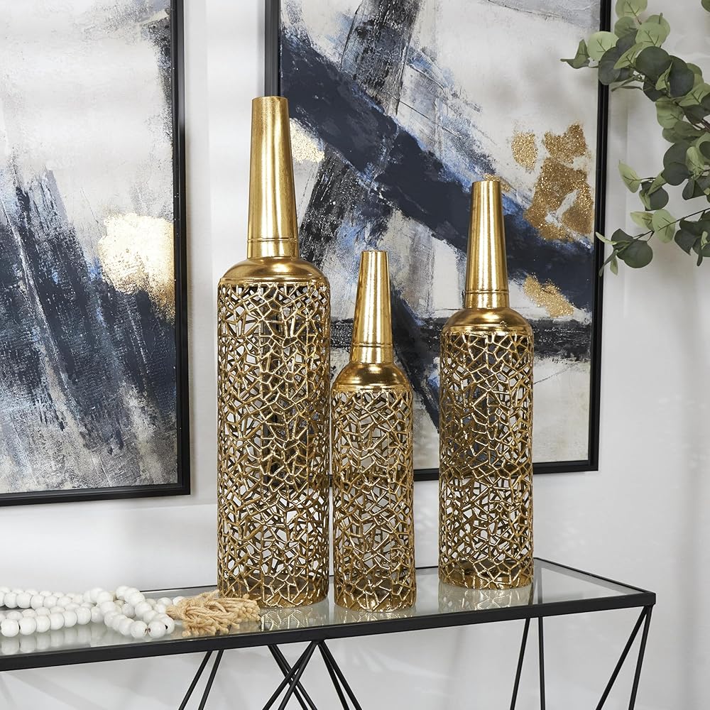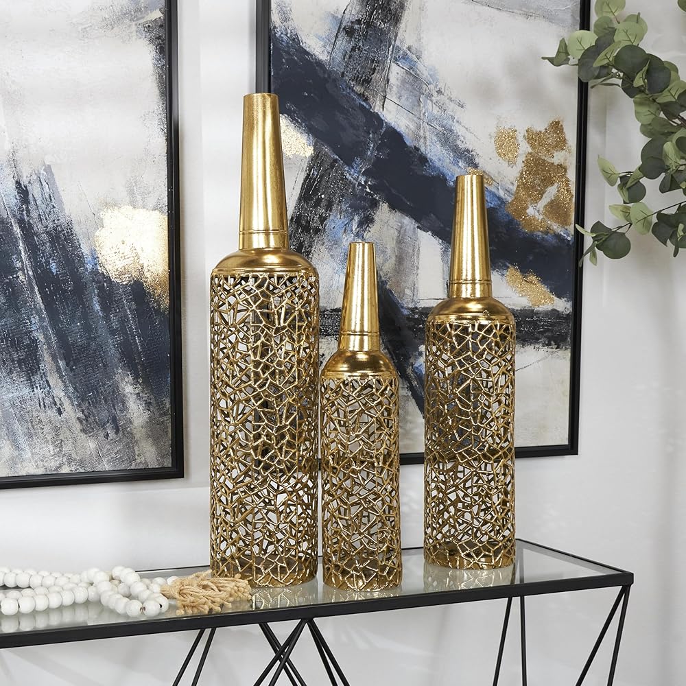 This glam set of 3 vases for home decor is welded with metal and applied with a satin gold finish for added sophistication. Satin gold vases for decoration have a round bottle-style shape with an intricate textured pattern. Wipe clean with a dry cloth. Accessorize your space effortlessly by displaying a beautiful floral arrangement or greenery with this decorative vase. Create a balanced surface space and added dimension with this beautifully crafted vase. Add a touch of glamour to your living room or office by decorating your tables with this gold set of 3 centerpiece vases that blend well on both light and dark-toned interiors. Designed with felt or rubber stoppers at the base that prevent scratching furniture and table tops, as well as sliding around. This item ships in 1 carton. Vases are shipped nested inside the largest vase, please open the largest one to find the others inside. Suitable for indoor use only. This item ships fully assembled in one piece. This gold colored iron vase comes as a set of 3. Glam style. Vases have 2 in, 1.60 in, and 1.30 in mouth openings.