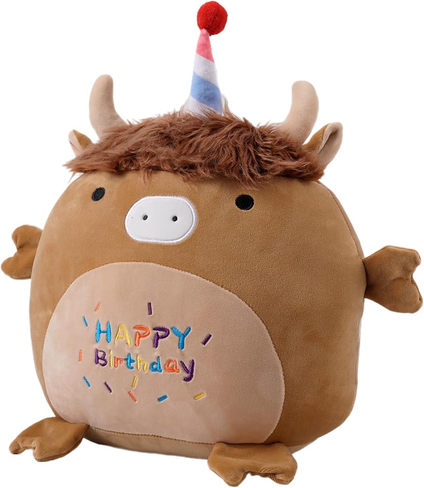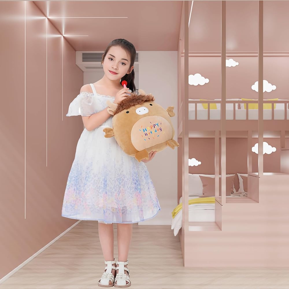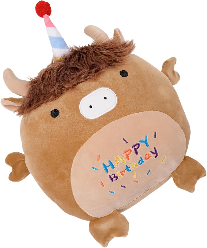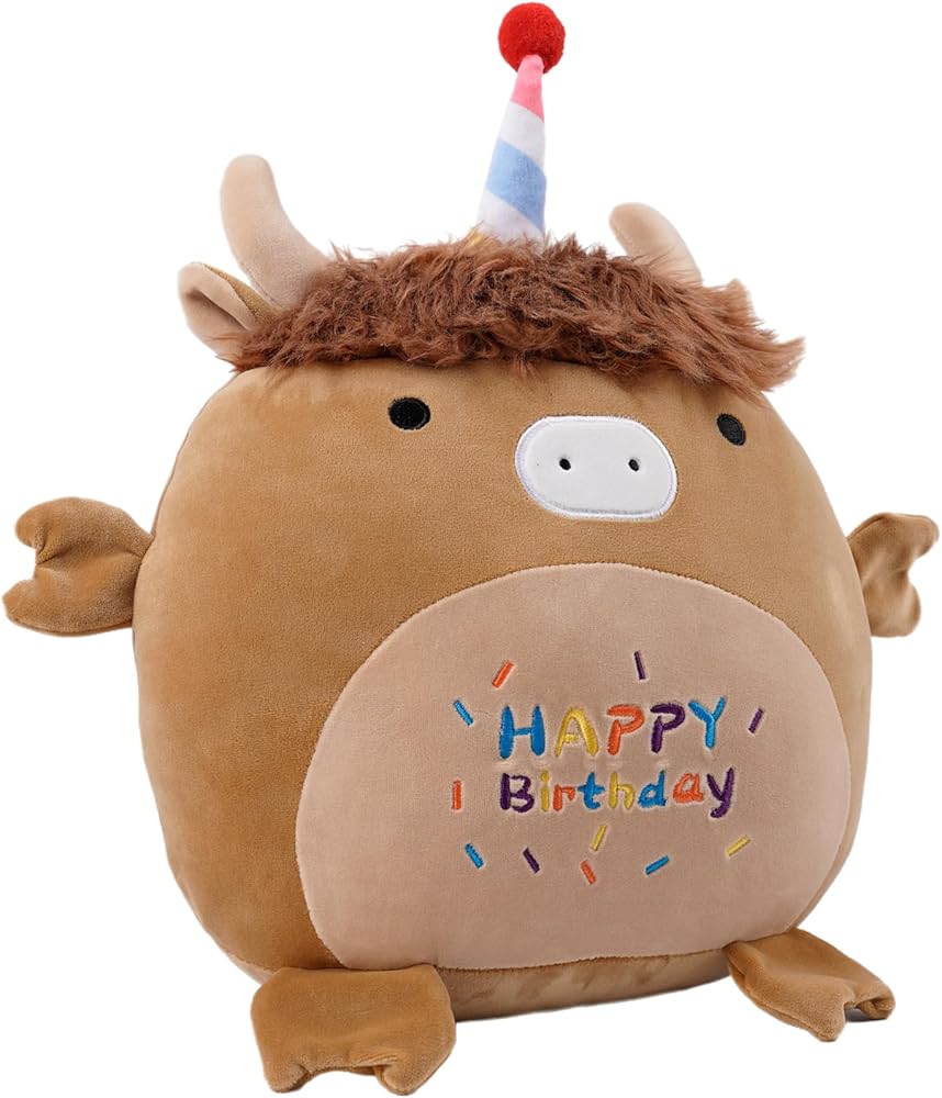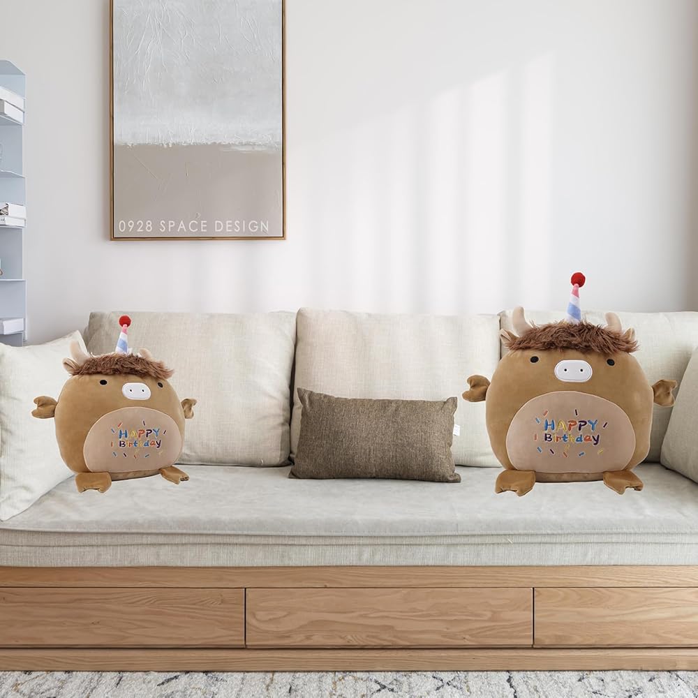 PERFECT GIFT - Our plush happy birthday brown cow toys are suitable for all ages, from toddlers to adults, perfect for play, collecting & cuddling. Everyone will love this plush pillow for play or as a cute pillow for reading, watching television, studying, and sleepy nap time. It is really comfortable to hold and support your lumbar. Sweet present for Christmas, Valentine's Day,Thanksgiving Day and birthday.