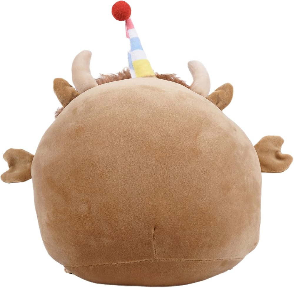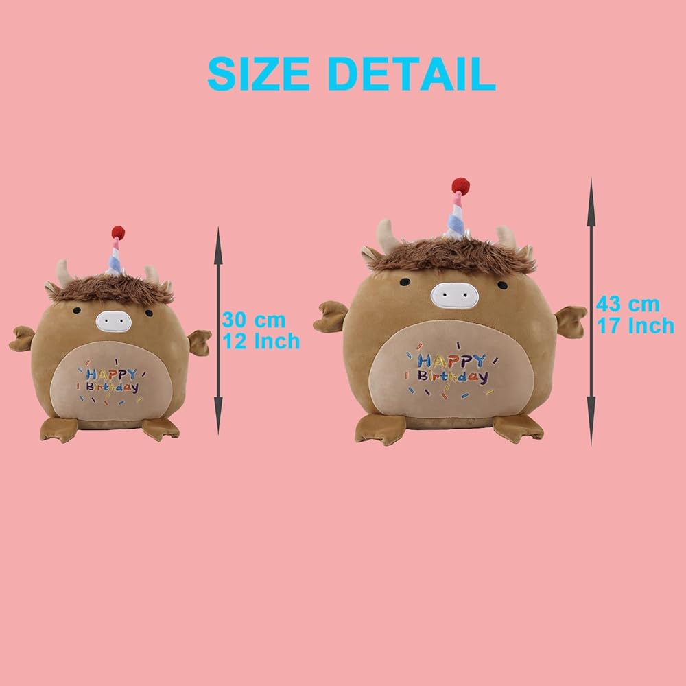 SIZE INFO - The stuffed happy birthday highland cow animals has 2 size 12 inch and 17 inch tall, not small but the right size for office, sofa, living room as a home pillow but also as a waist cushion and even as a nap pillow for the company.