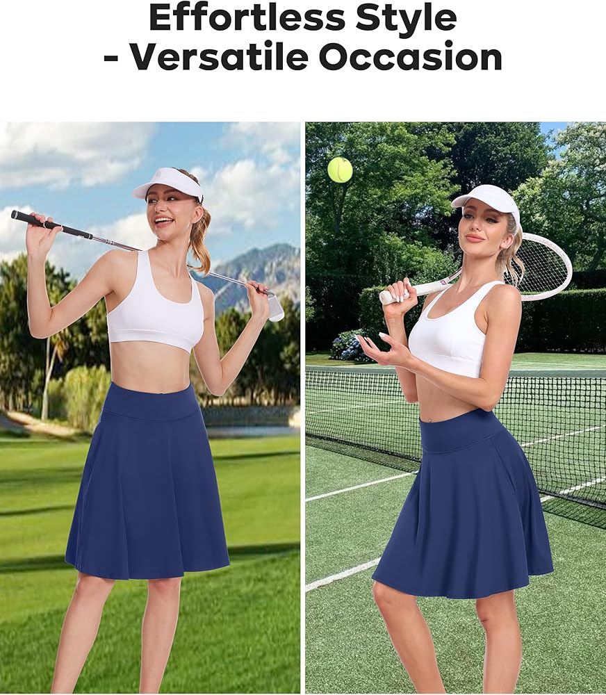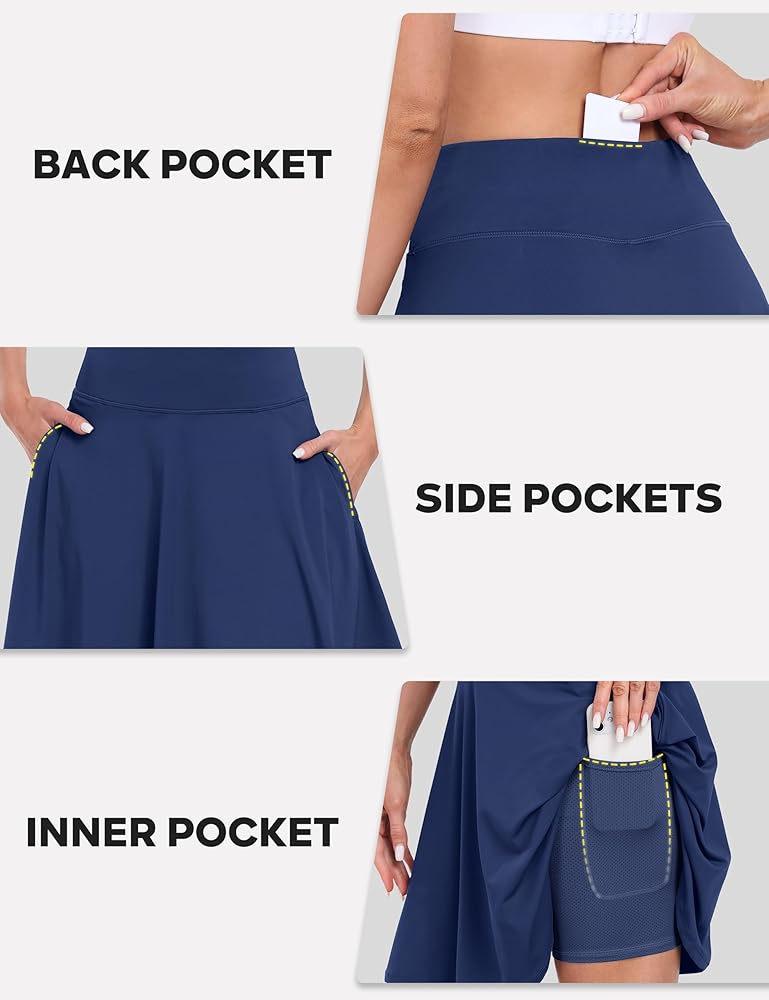 [Built-in Mesh Shorts & 4 Pockets]: Our 2-in-1 knee length women golf skort for women with 2 side pockets,1 back pocket, and 1 inner shorts pocket, which also feature inner non-see-through mesh shorts, providing secure storage for tennis balls, golf balls, or cell phones. The lightweight, breathable shorts ensure comfort and privacy, enhancing your performance on the court