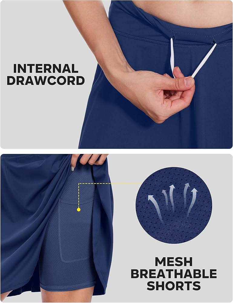 [High Rise & Adjustable Drawcord]: Featuring a tummy control high waistband, these tennis skorts with shorts underneath accentuate your waistline and hips while providing a sleek and streamlined look. The adjustable drawcord design provides comfort and a more fitting experience, preventing any slipping during your game