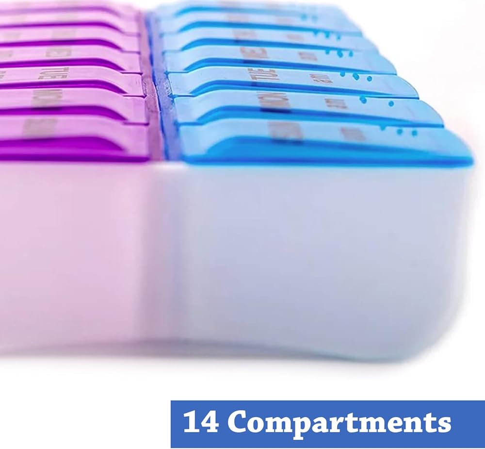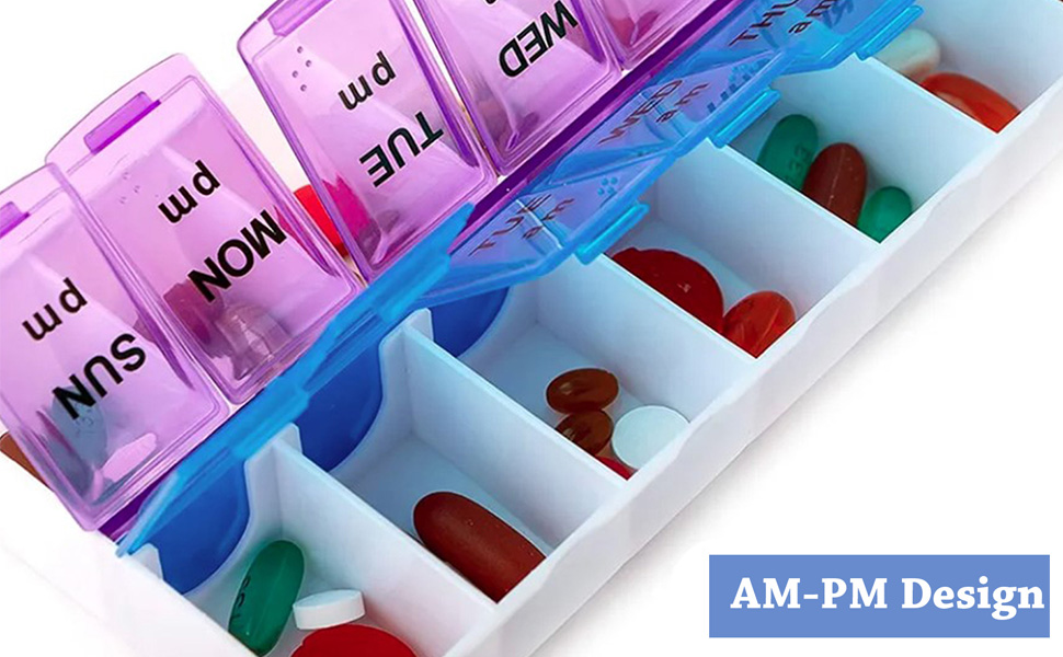 تصميم مكون من 14 حجرة: يأتي مع سبع حجرات فردية مع أغطية فردية. يمكن لصندوق حبوب الدواء المنظم هذا تخزين الحبوب وزيت السمك وأقراص الفيتامينات بسهولة.