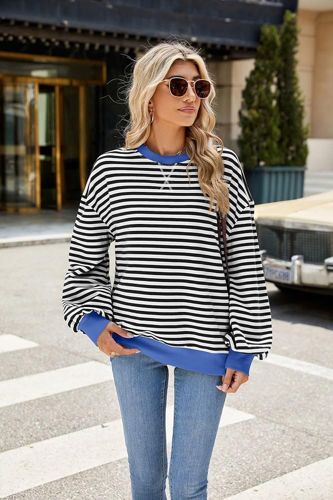 Care Oversized striped sweatshirts for women trendy 2024 long sleeve crewneck pullover tops, Machine wash recommended with a laundry bag, machine washable with like colors; please do not bleach; hang to dry. Size: S, M, L, XL, XXL. Package Contents:1 X Sweatshirt Shirt Top.