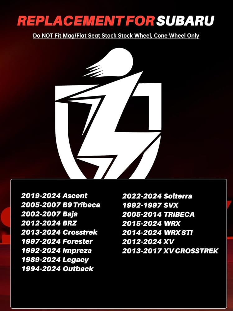 [APPLICABLE VEHICLE]: Aftermarket wheel lug nuts replacement for 1994-2024 Subaru Outback, 2013-2024 Crosstrek, 1997-2024 Forester, 2019-2024 Ascent, 1992-2024 Impreza. More detailed compatible models are available in the image content, please confirm your model and year before placing an order