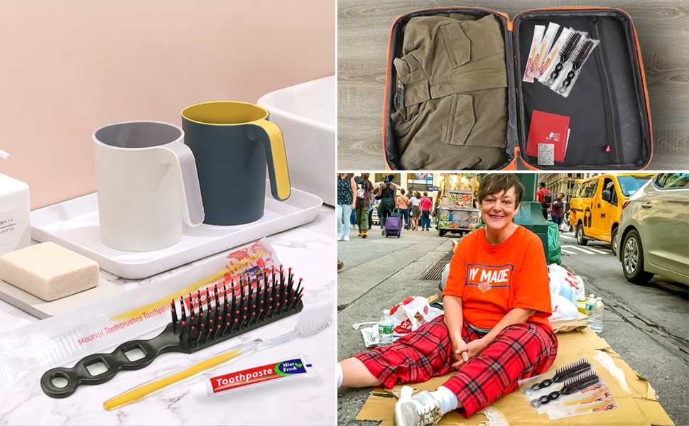 4.Individually wrapped hair brushes ,disposable toothbrushes with toothpaste throw away when used up, suitable for homeless, hotels,women's shelter, homeless care package supplies,air bnb/hotel/guest apartment.