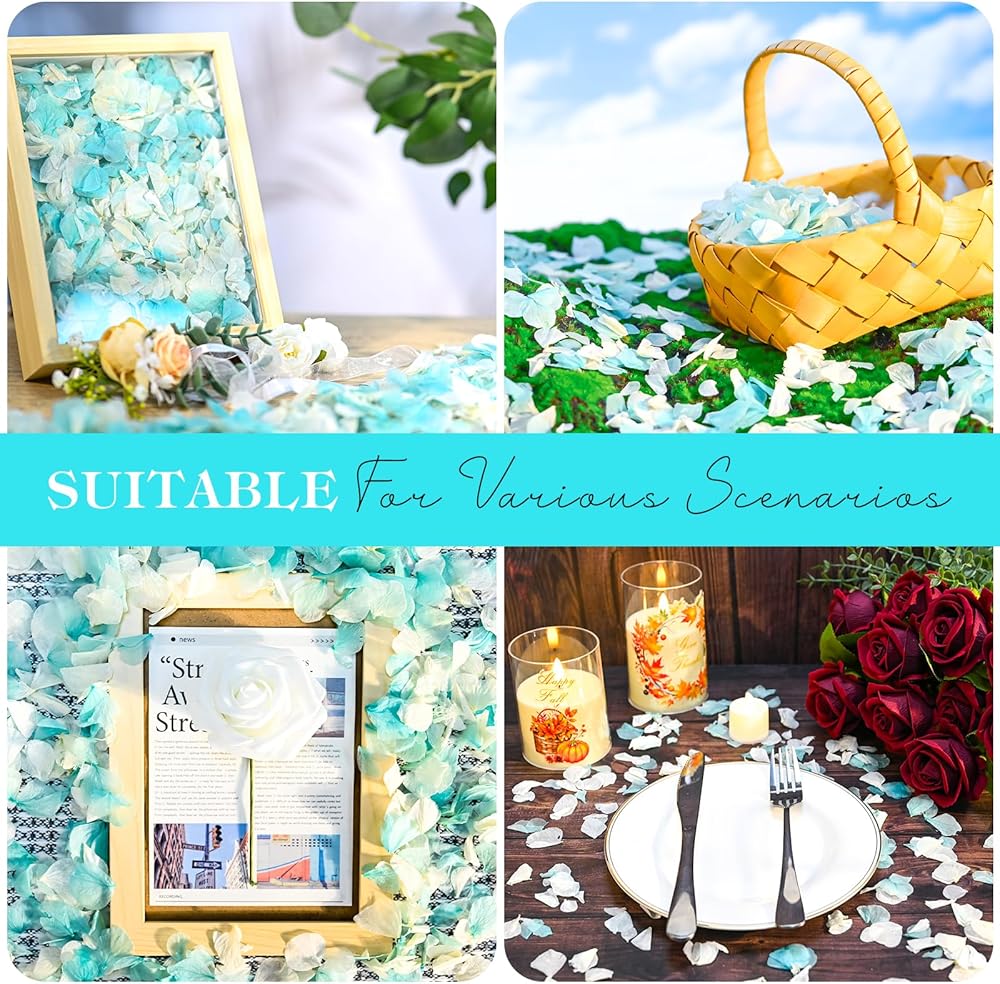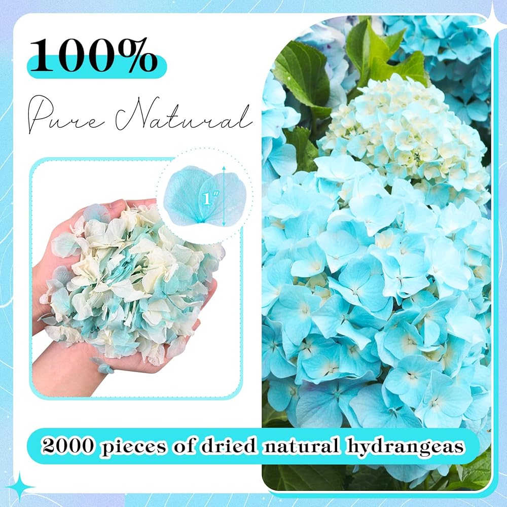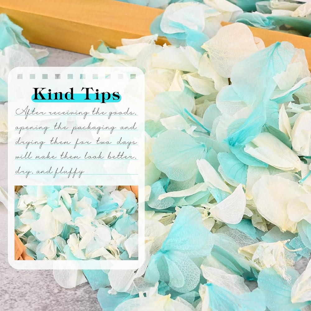 Real Hydrangea Petals: These delicate blue white dried petals are made from natural hydrangeas, and each petal is hand-picked and processed one by one. Unlike artificial petals, they maintain the shape and texture of hydrangeas, and each piece carries the delicate texture and fragrance of nature.