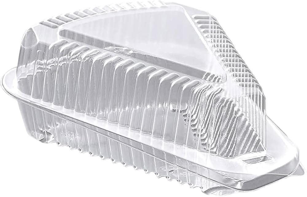 Package Quantity:50pcs Size: 5.4 x 4.4 x 2.5 inches Low dome hinge. Plastic containers with lid prepare, display and pack your goodies and baked goods using this clear triangle plastic container perfect for your individually sliced cakes and pastries. A versatile, high-quality plastic construction with a secure locking tab to seal and keep your food fresh and safe. PRODUCT FEATURES - Pack of 50 clear hinged plastic containers with medium dome lids design. Dimensions: 5.4 x 4.4 x 2.5 inches. Perfect storage for sizes from 7" to 10" in diameter. Transparent design for optimal visibility to perfectly display your product. Hinged lid tab to lock in flavor and freshness. Easy to open and close tabs Cake slice container made of cake made of high material Round corners to prevent damaged crust when tapped lightly during transportation To Go containers for sliced cheesecakes, such as plastic containers for cakes, solo cakes, chocolates, candies and more. Add labels and ribbons for a personalized touch to your company's packaging.