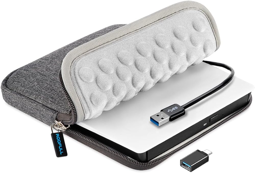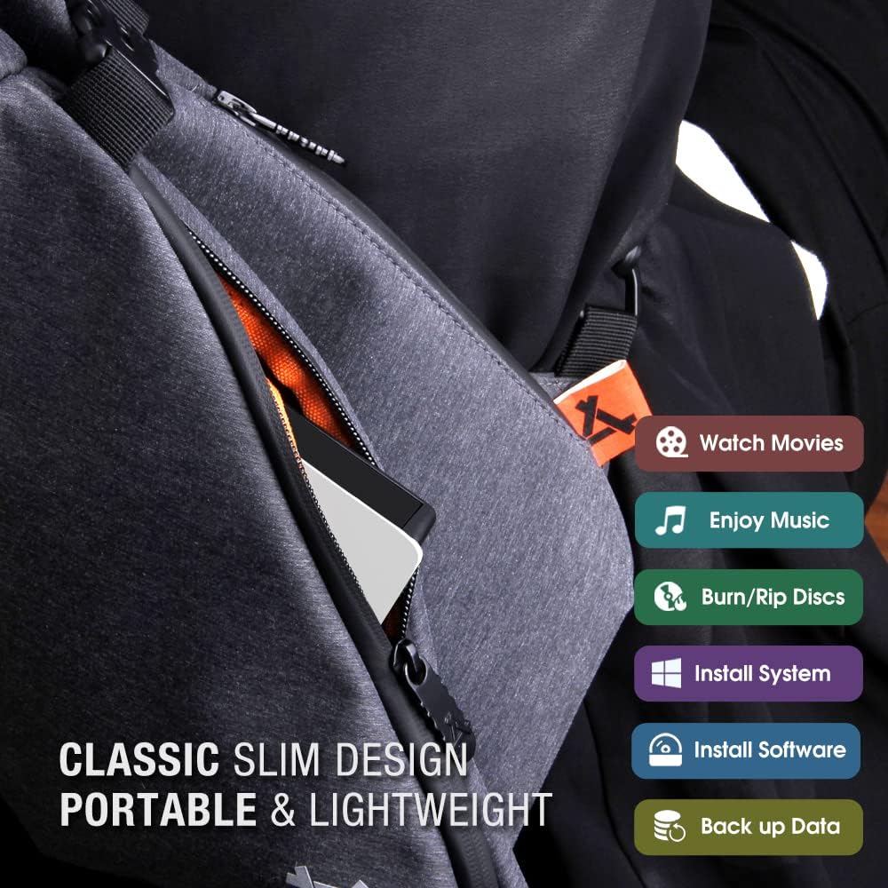 【Compact and Portable】Come with a thicker protective storage carrying case sleeve, you can easily carry and use this slim external optical player anytime anywhere, no matter in the office, school, at home, or during a trip. Waterproof, dustproof, and drop-proof.