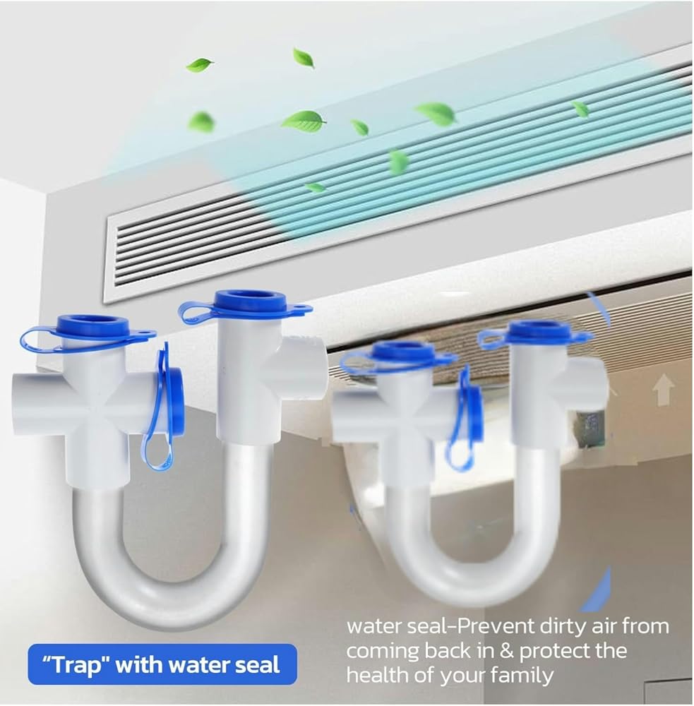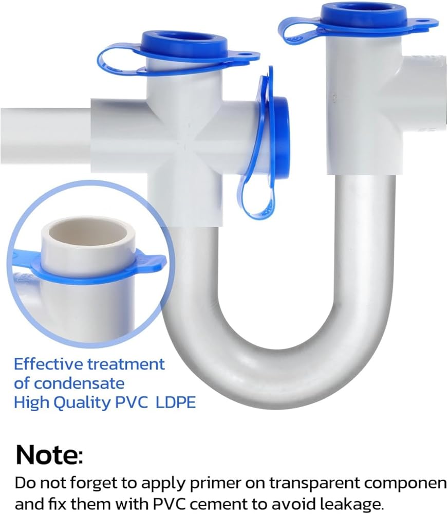• Transparent U-tube design: The design of a transparent PVC U-tube and an open blue cover allows you to easily check for sediment blocking the trap and open it for cleaning. This steam trap provides an automatic air blocking and water sealing device for the air conditioning drainage pipe, preventing the return of dirty air and polluting indoor air.