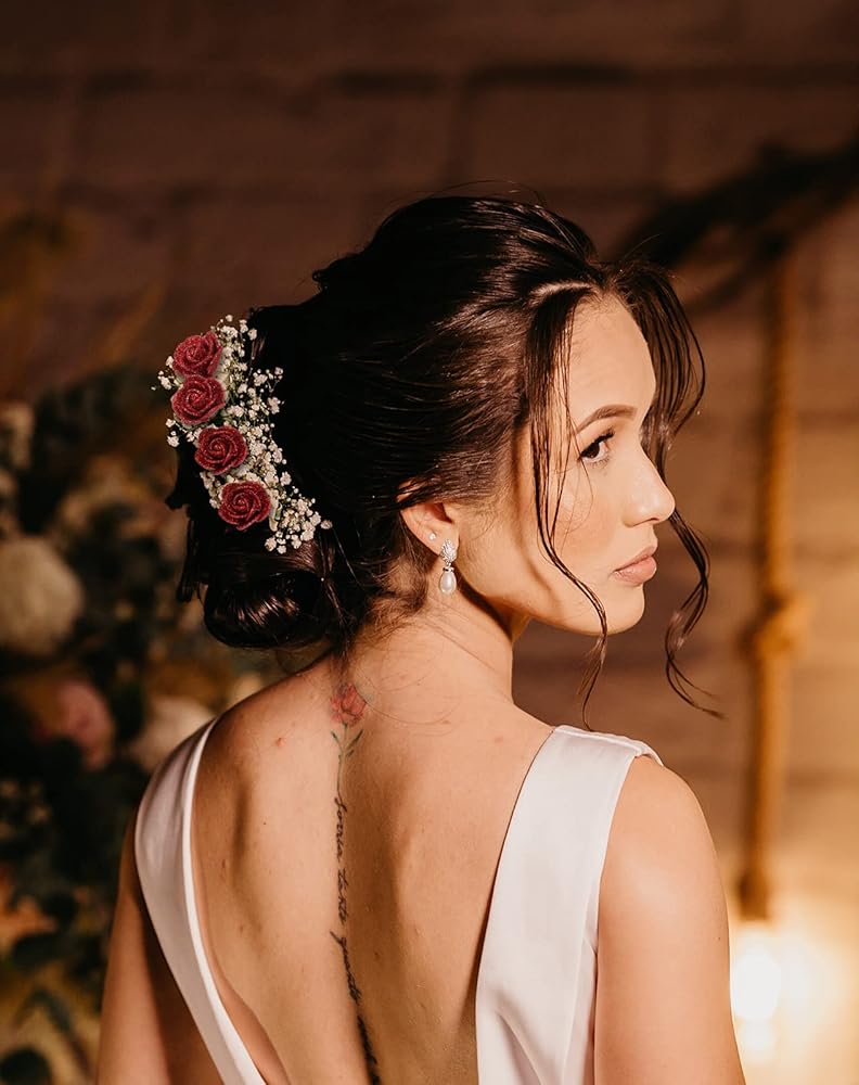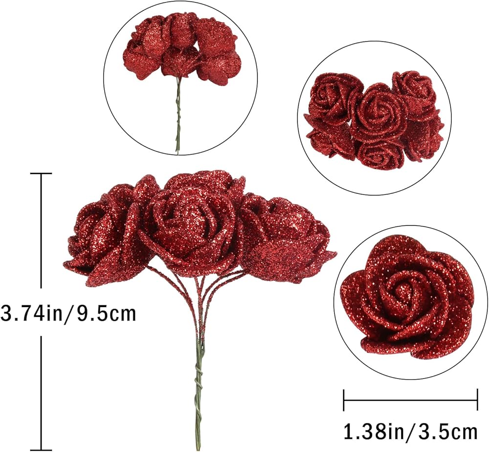 Packaging and Size:Each pack includes 12 bouquets of small roses, one bouquet of roses has 6pcs mini roses, you can receive 72pcs mini glitter roses.A small bouquet of roses is 9.5cm/3.74 inches high, and the diameter of each rose head is 3.5cm/1.37inches