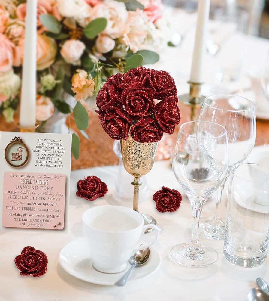 Note:Due to the particularity of the glitter rose material, it is normal to lose powder when received.Glitter rose flower are handmade and measured, the size of the flower heads may vary slightly from batch to batch