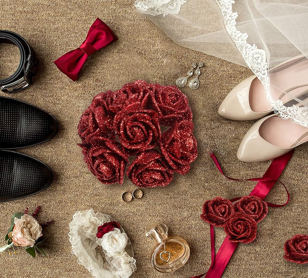 Material:Artificial roses are made of PE foam material, roses are covered with glitter, glitter powder material let it brighter,shining.A moderate amount of glitter falling is normal and will not affect the beauty of the flowers