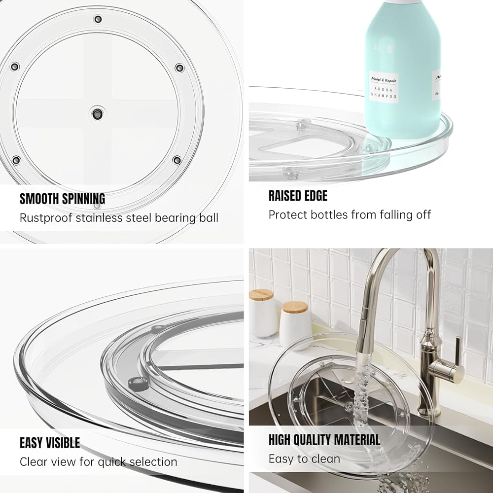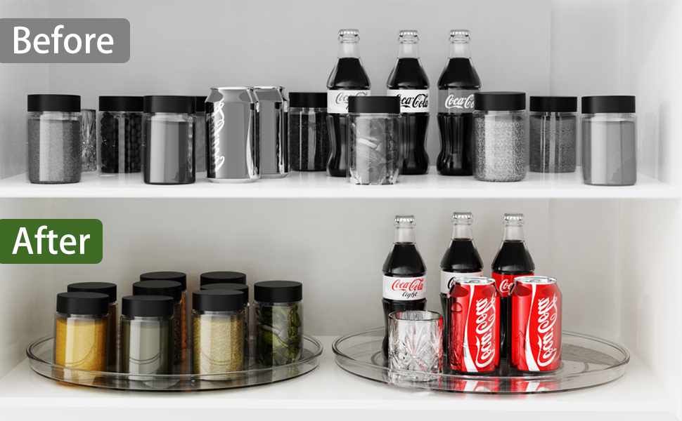 Ideal Size: Each pantry lazy susan organizer measures 10.6" x 10.6"x 1". The 1 inch outer rim prevents items from falling off as you turn. Perfect acrylic lazy susan for pantry organization and storage.