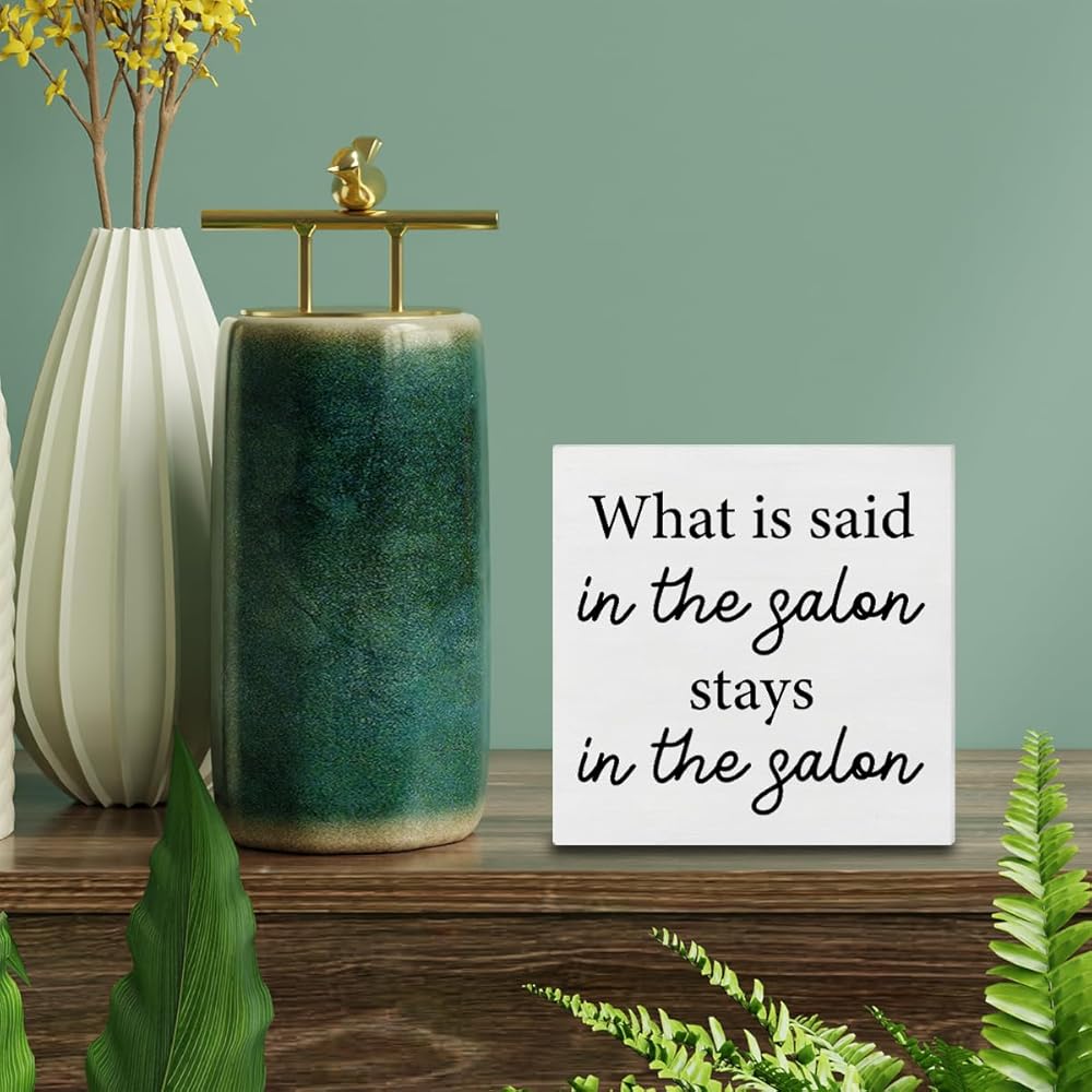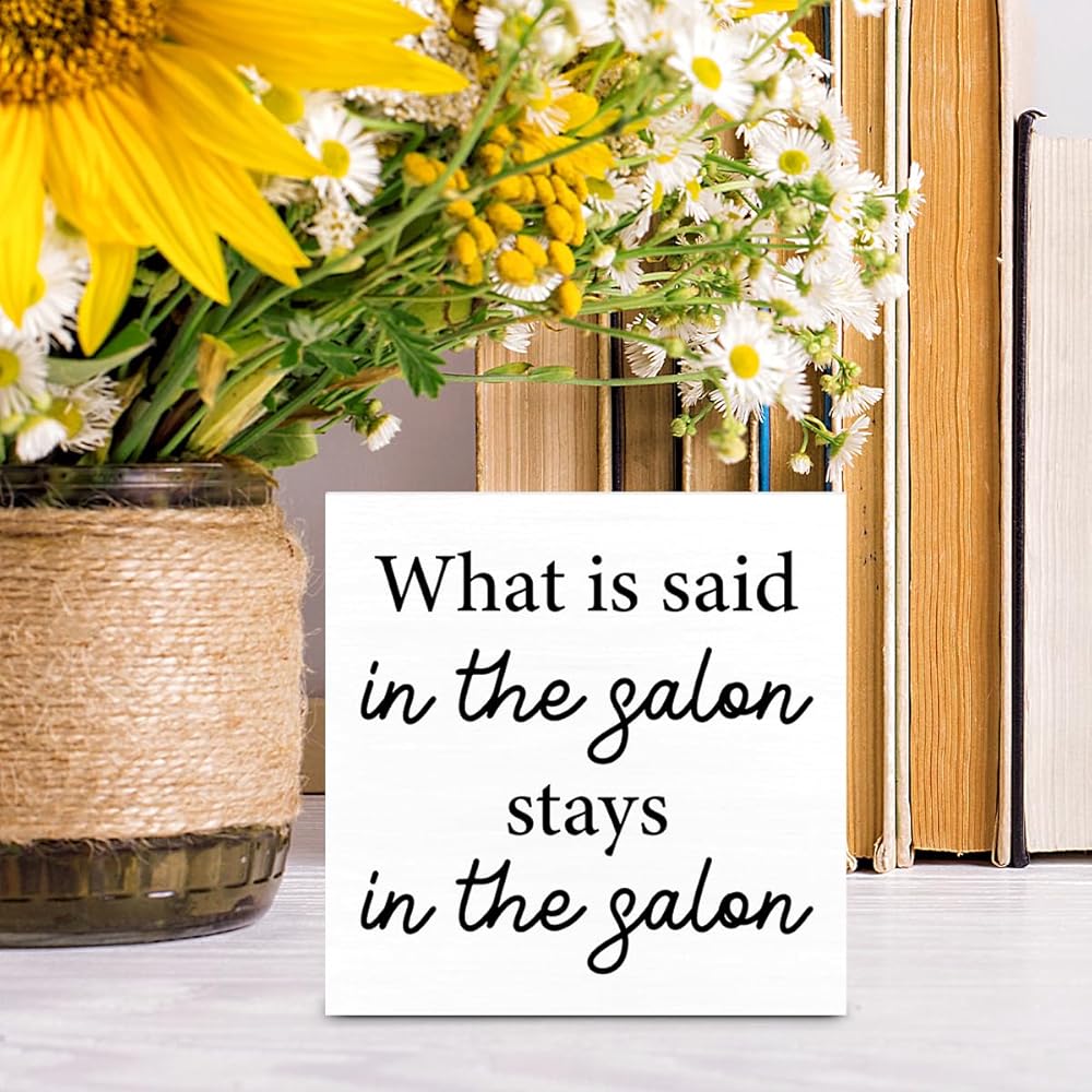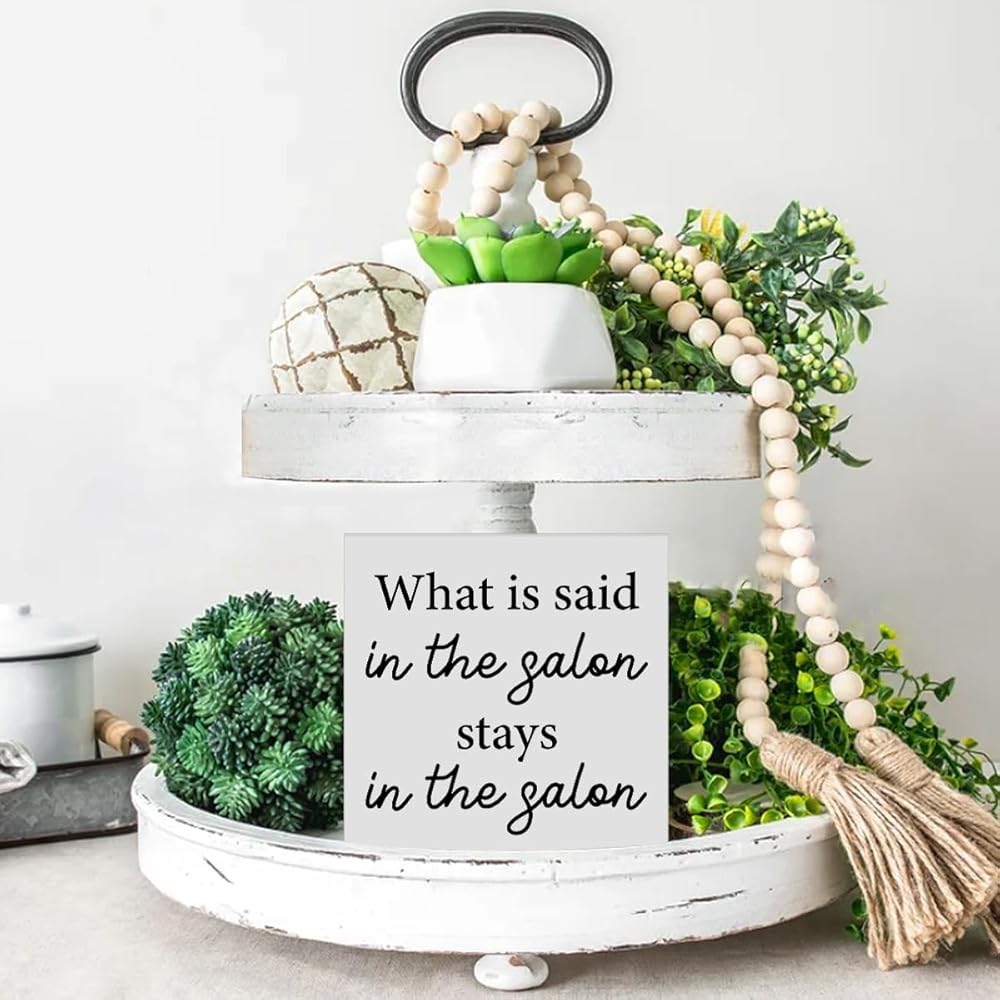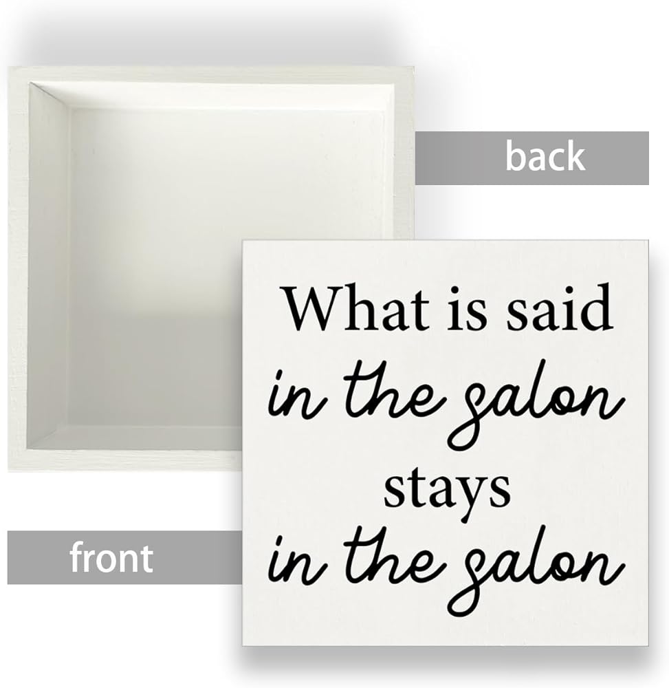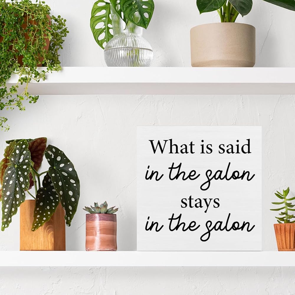 Hairstylist Gifts What Is Said in the Salon Wood Sign Farmhouse Hairdresser Signs Home Hair Salon Beauty Shop Barbershop Decor for Desk Table Shelf Tabletop, 5 x 5 Inches