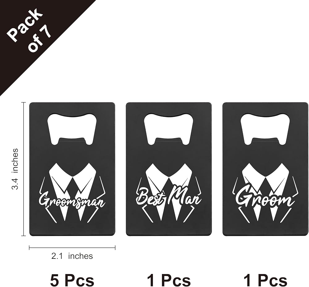 【Content】The 7 pack bottle opener that be printed "GROOM" , "BEST MAN", "GROOMSMAN" and theme white logo,include 1 GROOM, 1 BEST MAN and 5 GROOMSMAN metal bottle openers