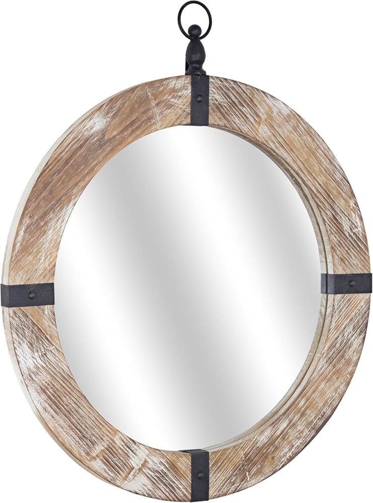 Rustic decor can sometimes impart weathered elegance and vintage charm to a room. This simple yet stunning circular mirror is the perfect example of such a piece. Featuring a border of textured whitewashed wood and sturdy oxidized metal brackets, this maritime-inspired decor piece instantly brightens your space.
