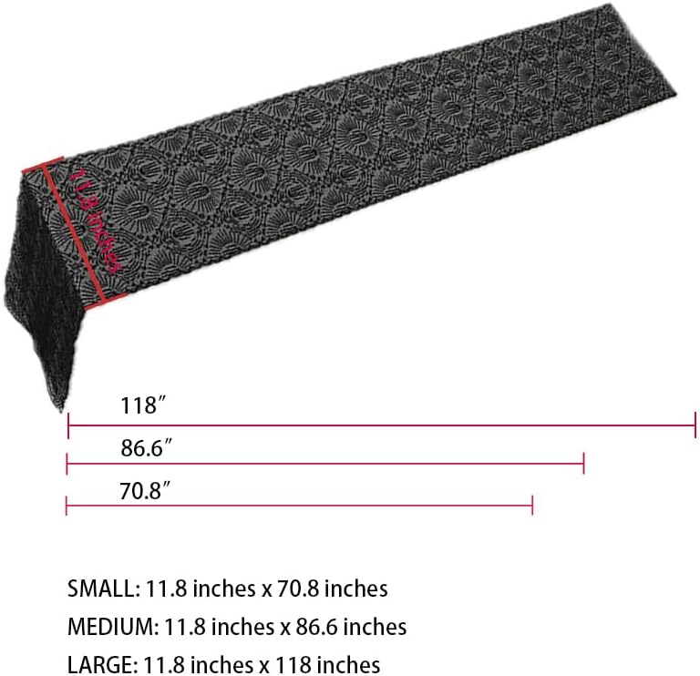 Halloween party decorative table runner have 3 sizes: 11.8 inches x 70.8 inches, 11.8 inches x 86.6 inches, 11.8 inches x 118 inches; and 3 patterns: spider, spider web, bones. Made of polyester, black lace fabric. Get that to decorate your room, house, and garden. Halloween holiday deocr for table, cabinet and bed.