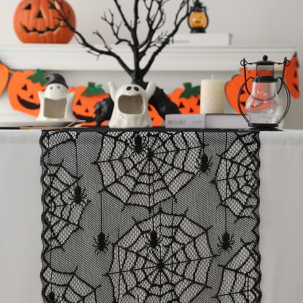 Made of polyester; Black lace fabric with 3 patterns: spider, spider web and bones; fits to any table, cabinet, bed, desk and more