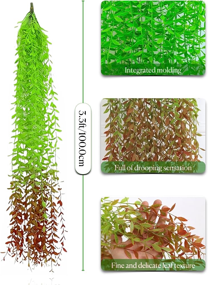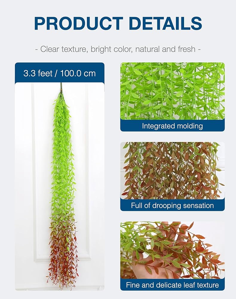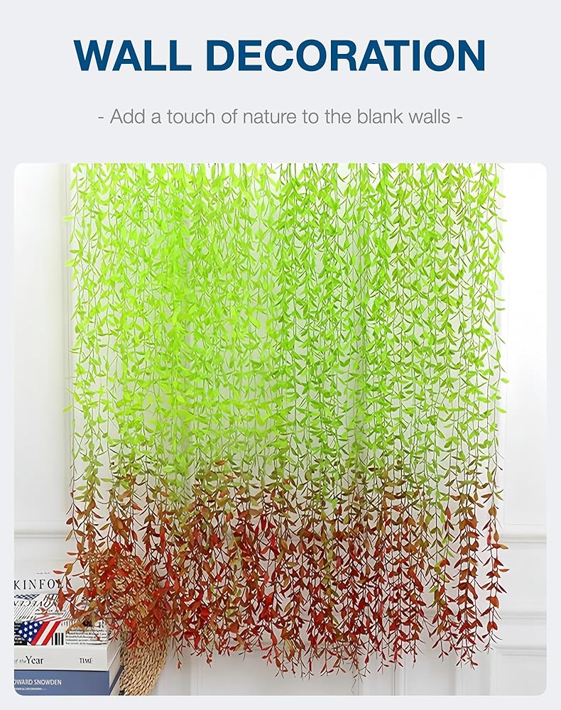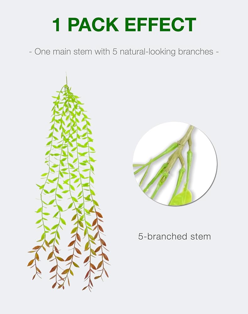 IN the BOX: 1 packs of artificial hanging plants, containing five 3.3 foot long fake willow vines, used for interior and exterior decoration, wedding decoration, or photography props.