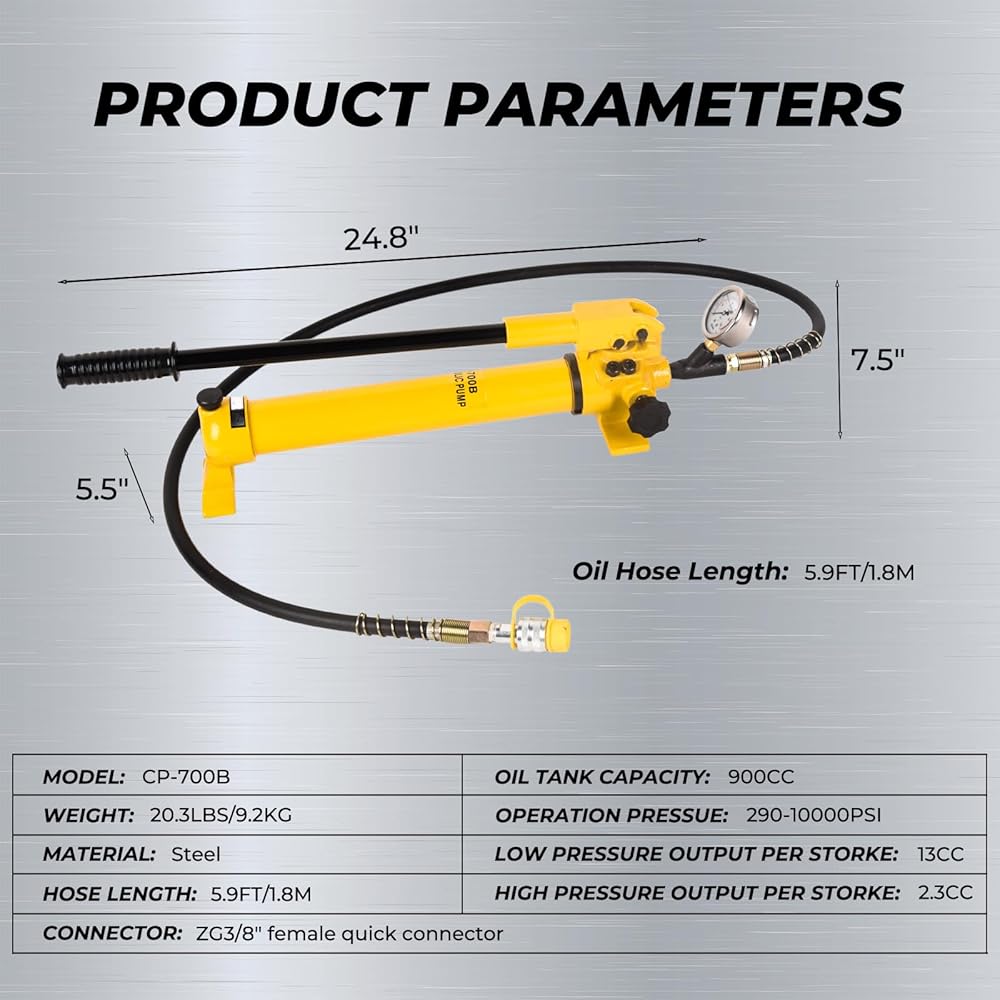 【HYDRAULIC PUMP DETAILS】This hydraulic pump features a 900cc oil capacity, with a low pressure output of 290Psi and a high pressure output of 10000Psi. It includes an oil pipe coupling with a ZG3/8" female quick connector and a 70"/1.8m hose length for easy operation.