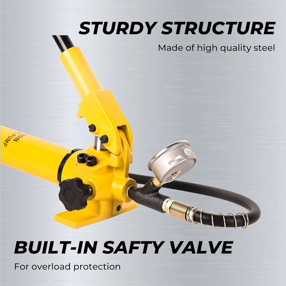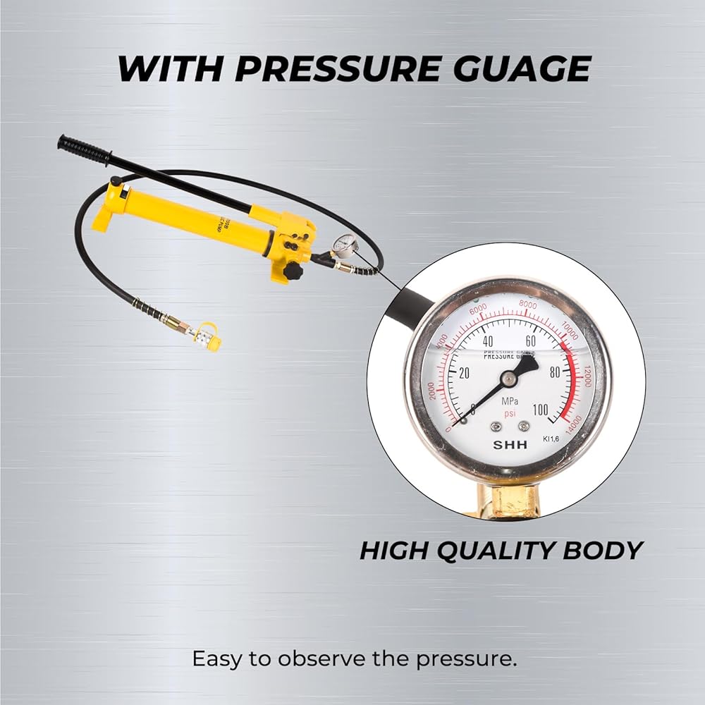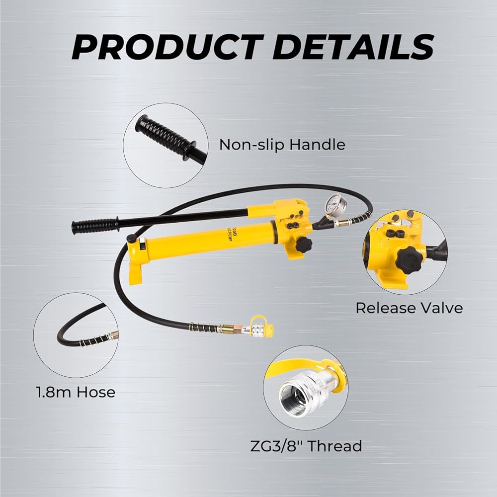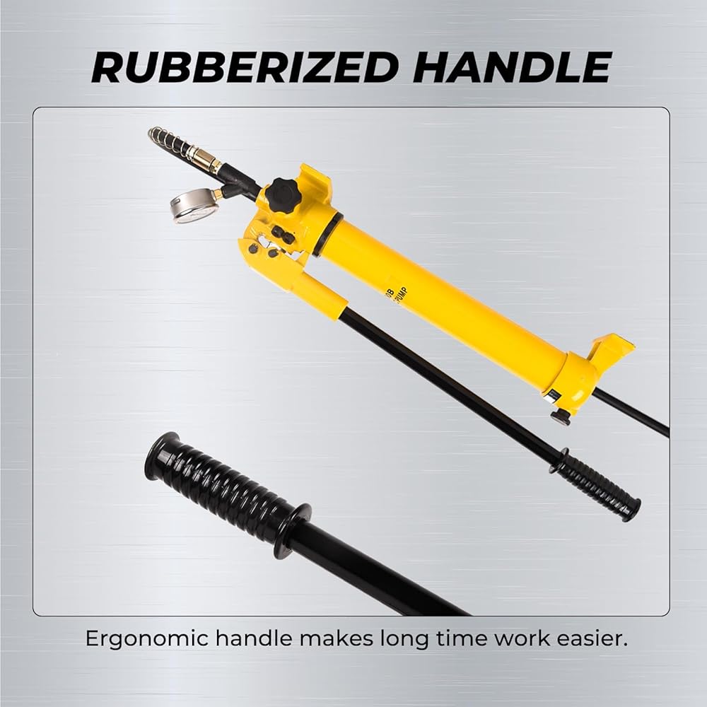 【ZG3/8" COUPLER INCLUDED】Easily adapts to a wide range of hydraulic accessories including hoses, rams, pumps, spreaders, and more, using common ZG3/8" fittings. Plus, our hydraulic hand pump with gauge features an extra-long handle with a rubberized grip for comfortable and easy operation.