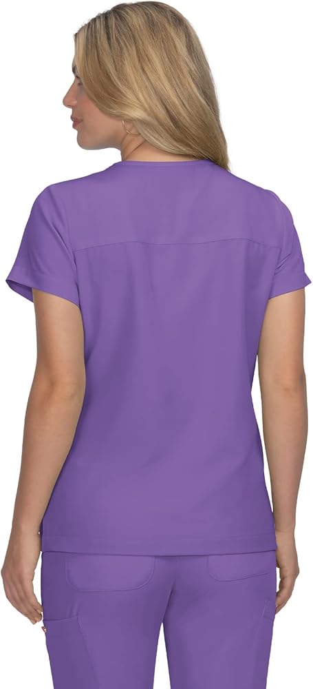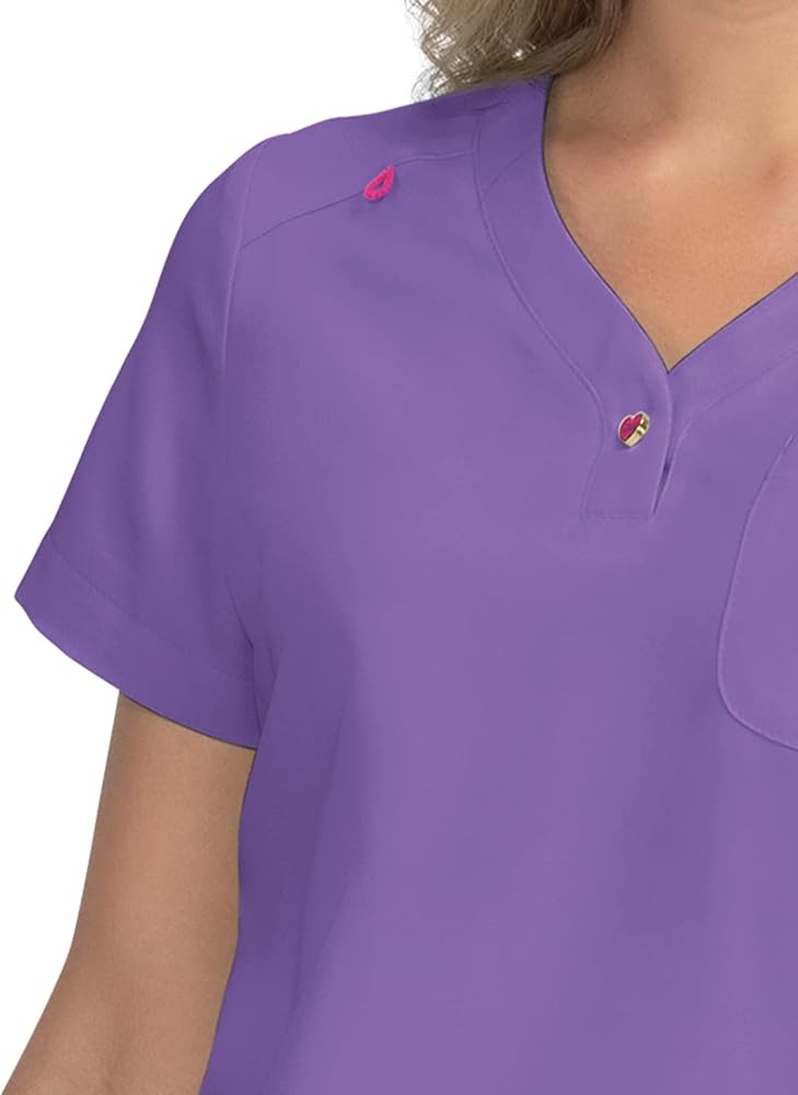 Super cute top with a heart-shaped snap at neck. Modern Classic Fit. Heart-shaped snap at neckline Chest pocket Can be worn tucked in or out Bungee loop for ID badge Side slits Length size Small: 27" 73% polyester, 22% rayon, 5% spandex stretch twill